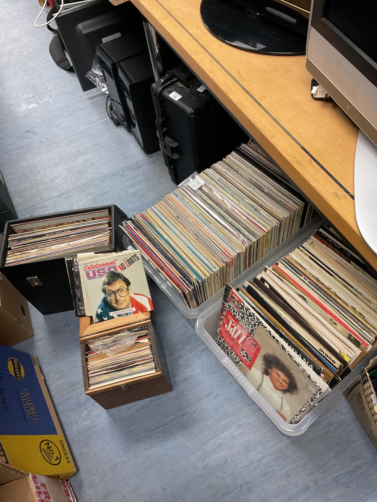 This is a large collection of vinyl records, comprising both 12-inch LPs and 7-inch singles. The collection appears to span various genres, offering a diverse selection for music enthusiasts. The records are stored in a mix of cardboard boxes and plastic crates, suggesting a long-held accumulation.