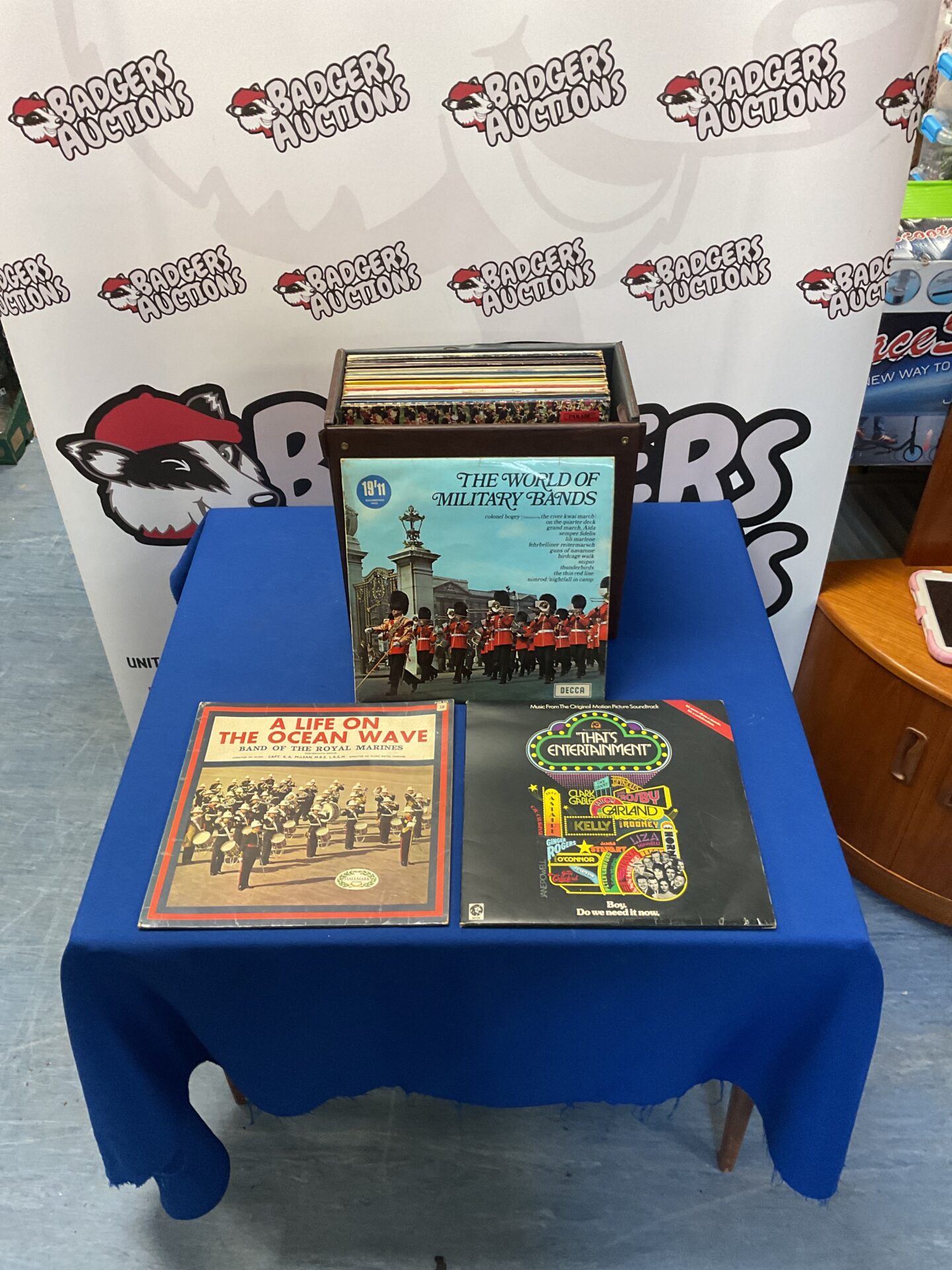 This lot comprises a selection of vinyl records, including a Decca record titled “The World of Military Bands”. The records appear to cover a range of musical styles, with a focus on military band music as evidenced by the featured Decca record. This collection offers a glimpse into the popular music and entertainment of the mid-20th century.