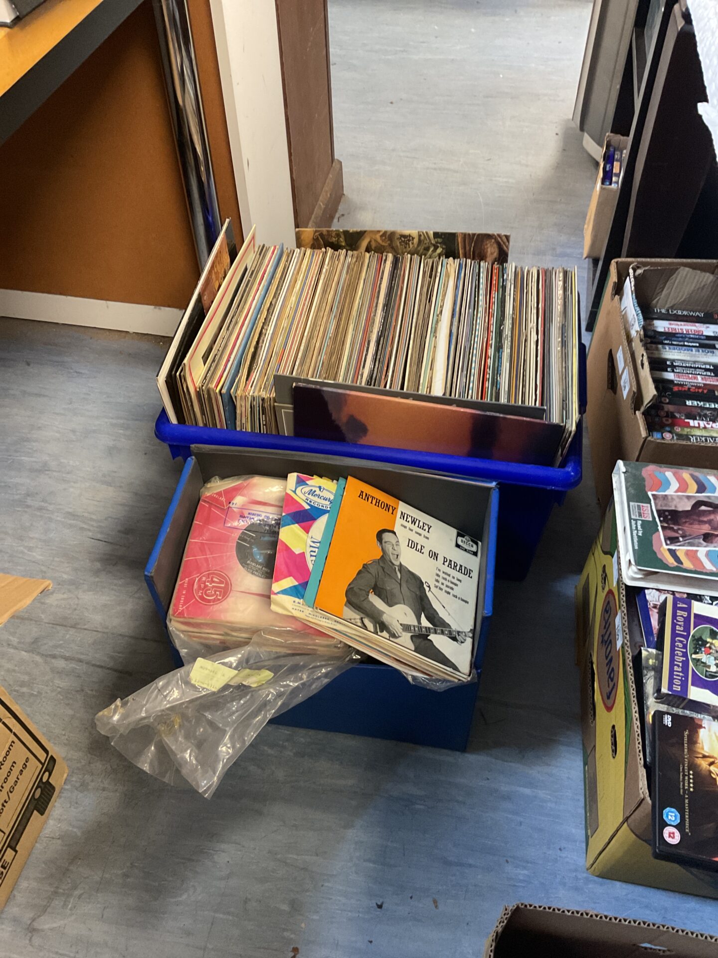 This lot comprises a collection of vinyl records, housed within a blue plastic storage case. The records represent a mixed genre selection, offering a variety for music enthusiasts. The collection appears to be a varied assortment, potentially spanning different eras and musical styles.