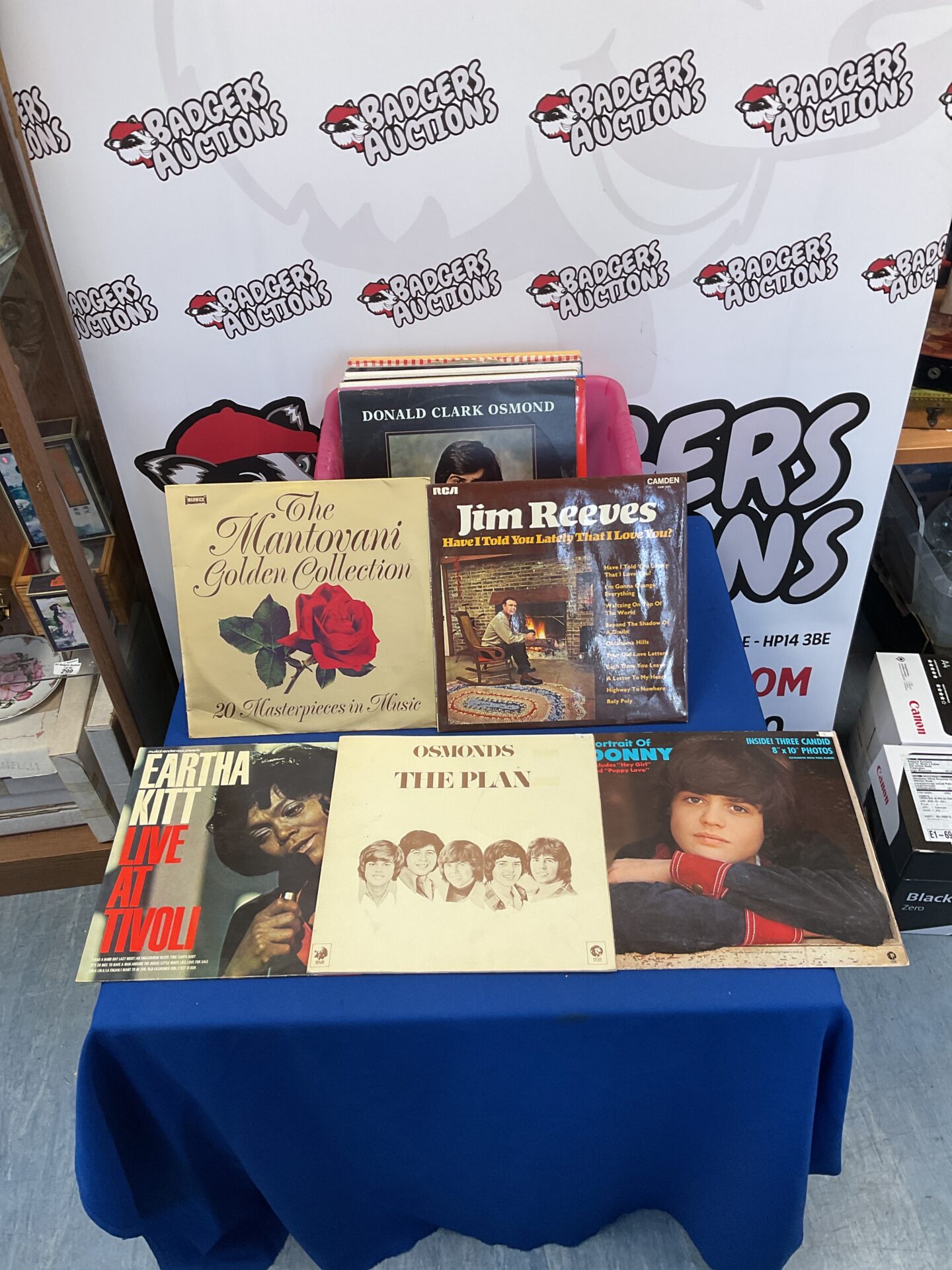 This lot comprises a selection of twelve-inch vinyl records featuring artists such as Jim Reeves, Eartha Kitt, and Donald Clark Osmond. These records represent a diverse range of musical styles from the mid-20th century, offering a glimpse into popular music of the era. The collection is ideal for vinyl enthusiasts and collectors seeking to expand their music library with classic artists.