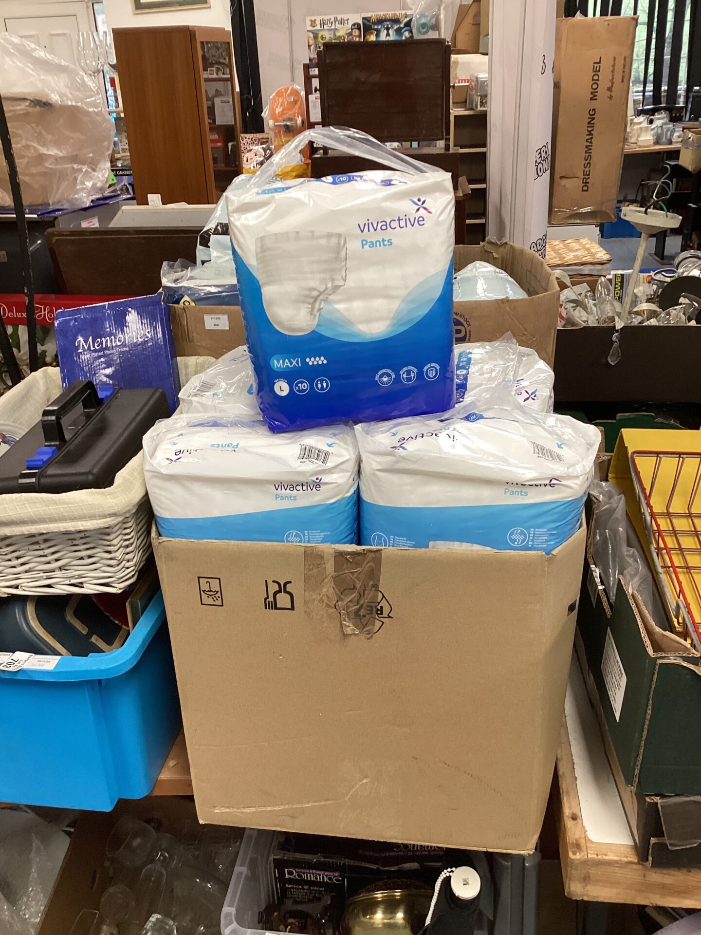 Six unopened packs of size large vivactive incontinence pants. These disposable pants offer comfort and discretion for managing incontinence. Ideal for caregivers or individuals needing a reliable supply of healthcare products.