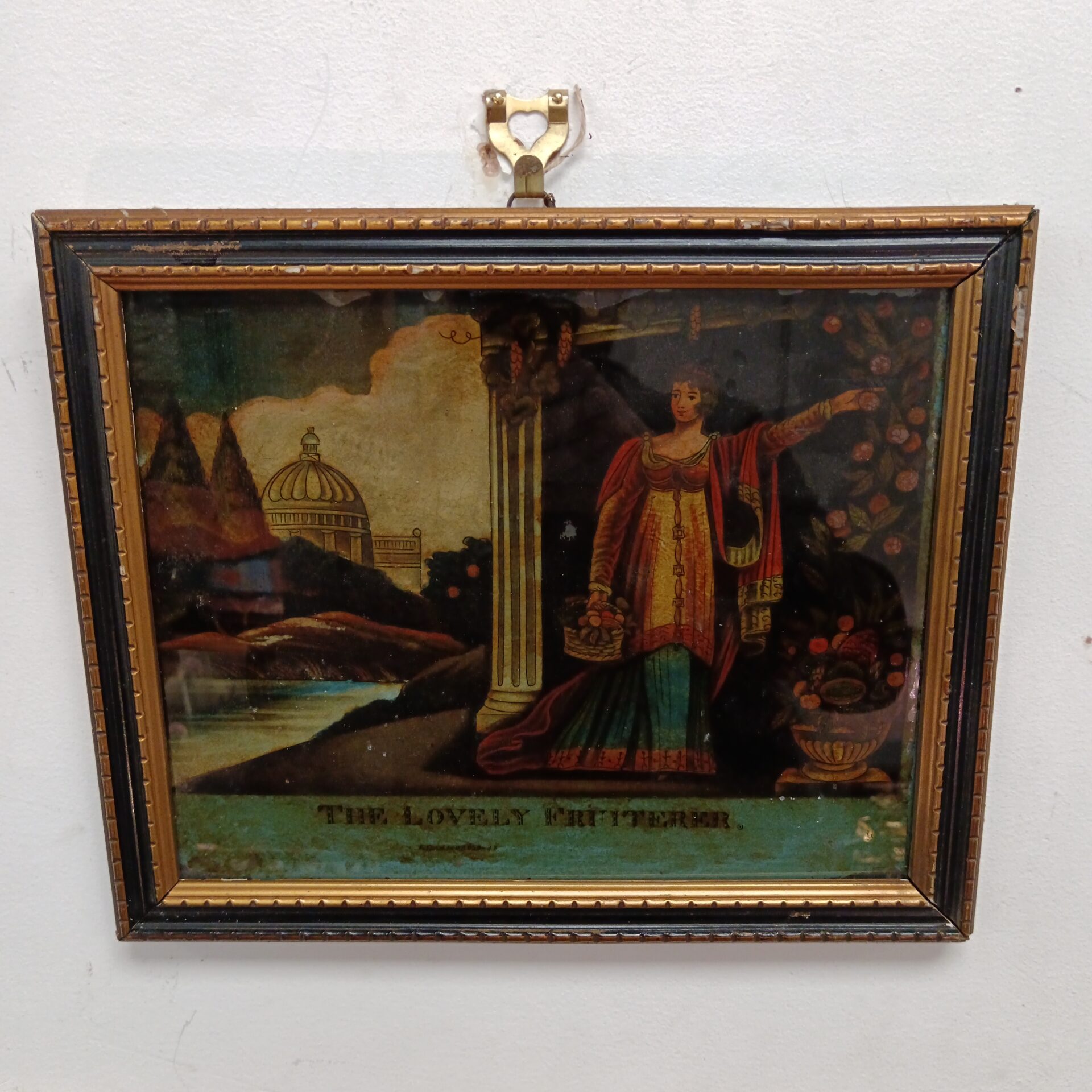 This is an antique engraving titled “The Lovely Fruiterer” by W B Walker. The print depicts a classically-dressed woman carrying a basket of fruit, set within a pastoral landscape featuring architectural elements and a flowing stream. The style is reminiscent of 19th-century romanticism, with attention to detail in the rendering of the figure, foliage, and background scenery.