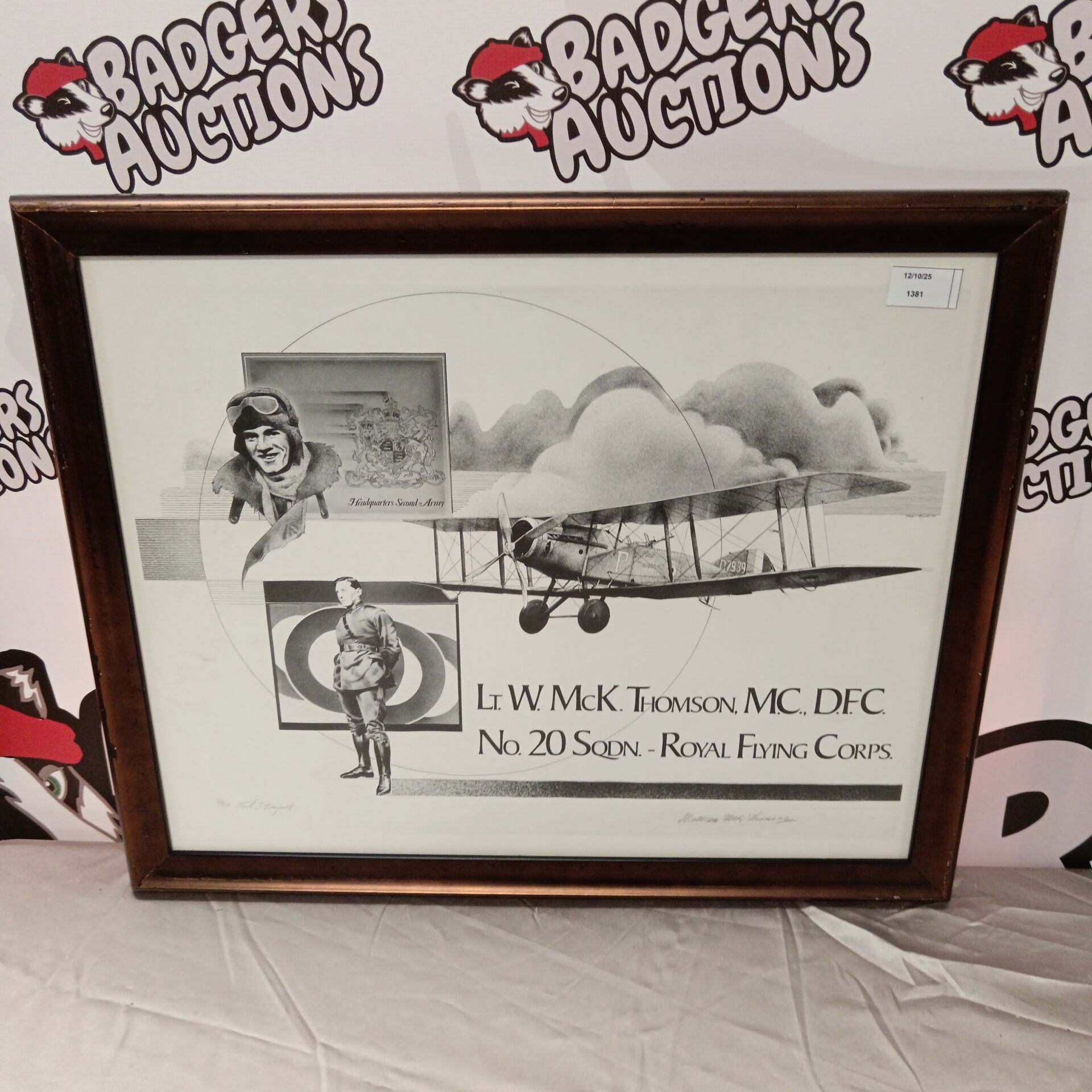 This is a beautifully rendered limited edition print depicting Lieutenant W McK Thomson, created by artist Richard J Bryant. The print captures a poignant moment, showcasing Thomson’s service with the Royal Air Force. It is a highly detailed piece, capturing the essence of early aviation and the bravery of those who served.