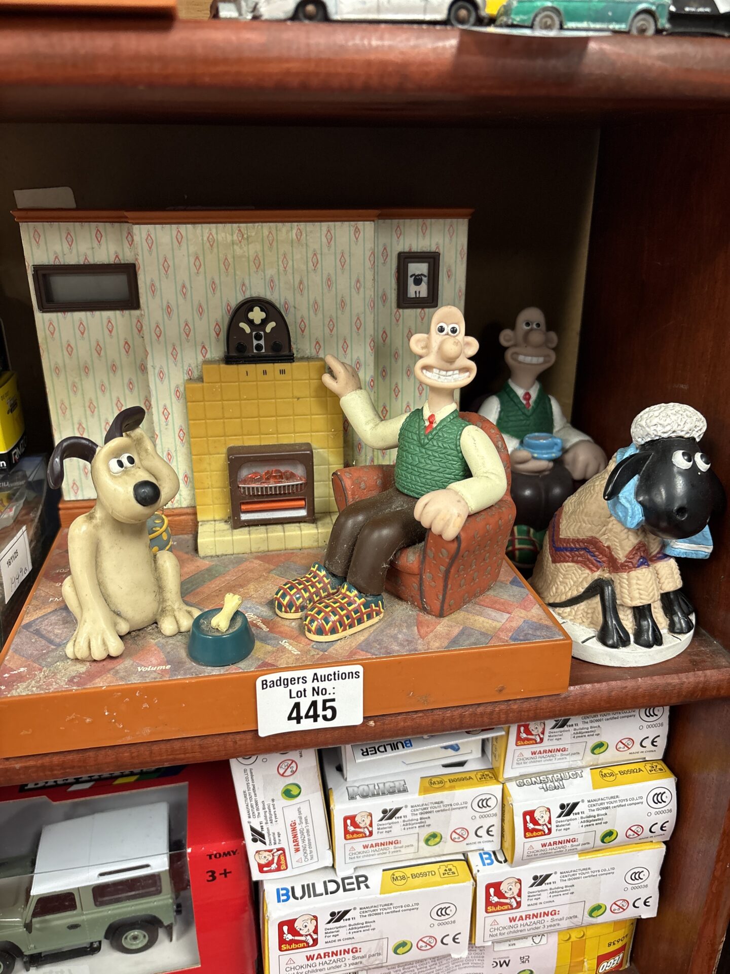 This lot features a Wesco Wallace and Gromit radio alarm clock alongside two vintage Wallace and Gromit plastic figures. The alarm clock is a nostalgic piece of animation memorabilia, likely dating from the late 1990s or early 2000s. The figures depict Wallace and Gromit in classic poses, adding to the charm of this collectible set.