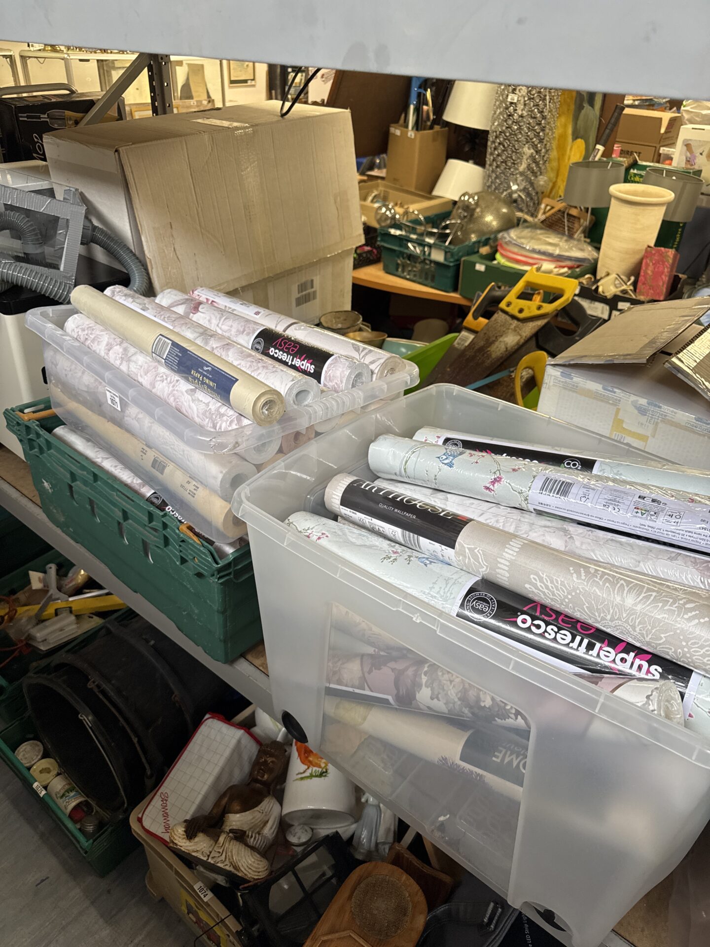 This lot comprises three boxes containing multiple rolls of new wallpaper. The rolls feature a variety of patterns and designs, suitable for various interior decoration projects. The wallpaper appears to be of a good quality, intended for use in living rooms, bedrooms, or hallways, offering a range of aesthetic options for home improvement.