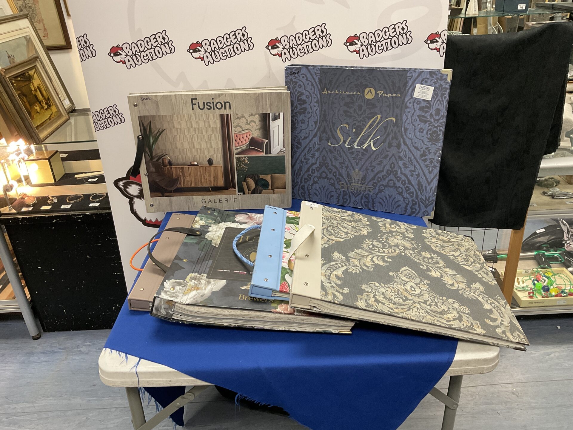 This lot comprises multiple wallpaper sample books, offering a diverse range of patterns, textures, and colours for interior design projects. These books showcase various wallpaper styles, from classic to contemporary, providing inspiration and material options for decorating homes or commercial spaces. The books are intended for professional designers or homeowners seeking to visualise and select wall coverings.