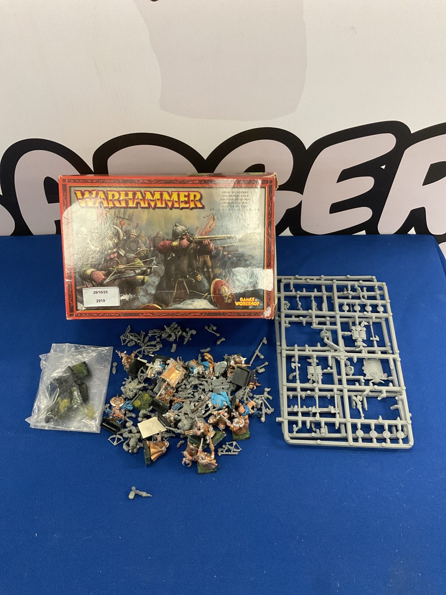 This lot features a box of Warhammer Dwarf Thunderers, a classic unit from the Warhammer Fantasy Battles range. These miniatures are designed to represent heavily armoured dwarf warriors armed with thunderers – powerful ranged weapons. The miniatures are made of plastic and are intended for assembly and painting, allowing for customisation and a personalised army.