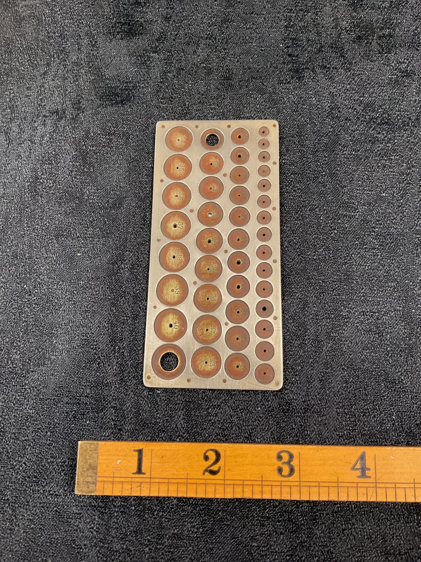 This is a precision gauge designed for watchmakers, specifically for measuring cylinder escape wheels. The gauge features a series of precisely drilled holes, each corresponding to a specific wheel size. This particular example appears to be constructed from brass, offering both durability and resistance to corrosion. It’s a vital tool for ensuring accurate fitting and functionality of delicate watch components.