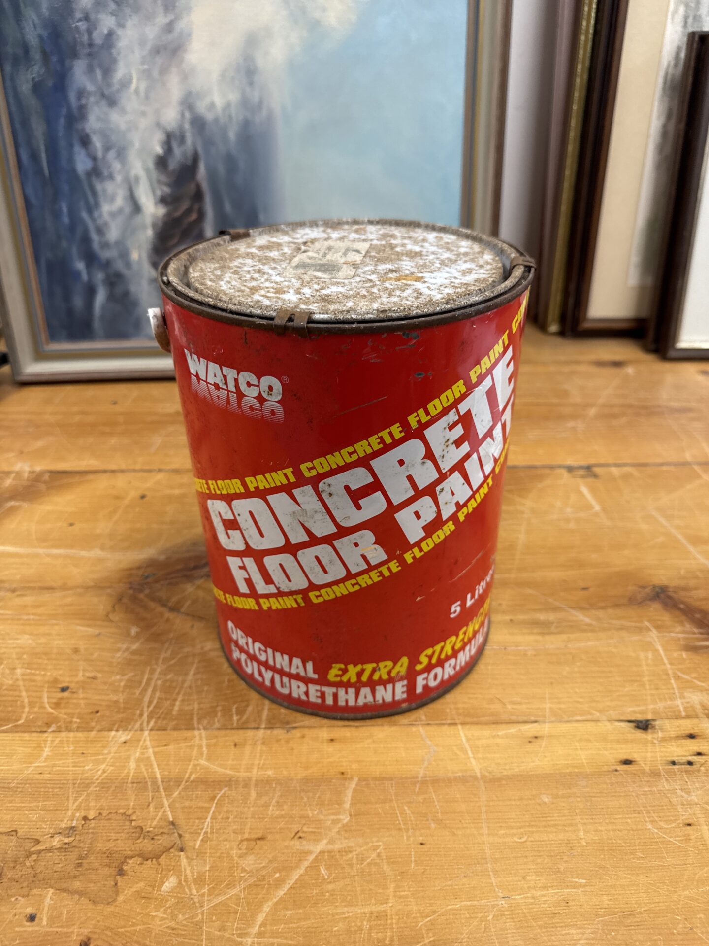 This tin of Watco concrete floor paint appears to be unopened and in excellent condition, suggesting it has been carefully stored. Original, unopened tins of industrial paints like this are becoming increasingly sought after by collectors of vintage ephemera and those restoring older buildings or workshops. It represents a piece of industrial history and offers a practical solution for those undertaking concrete floor painting projects.