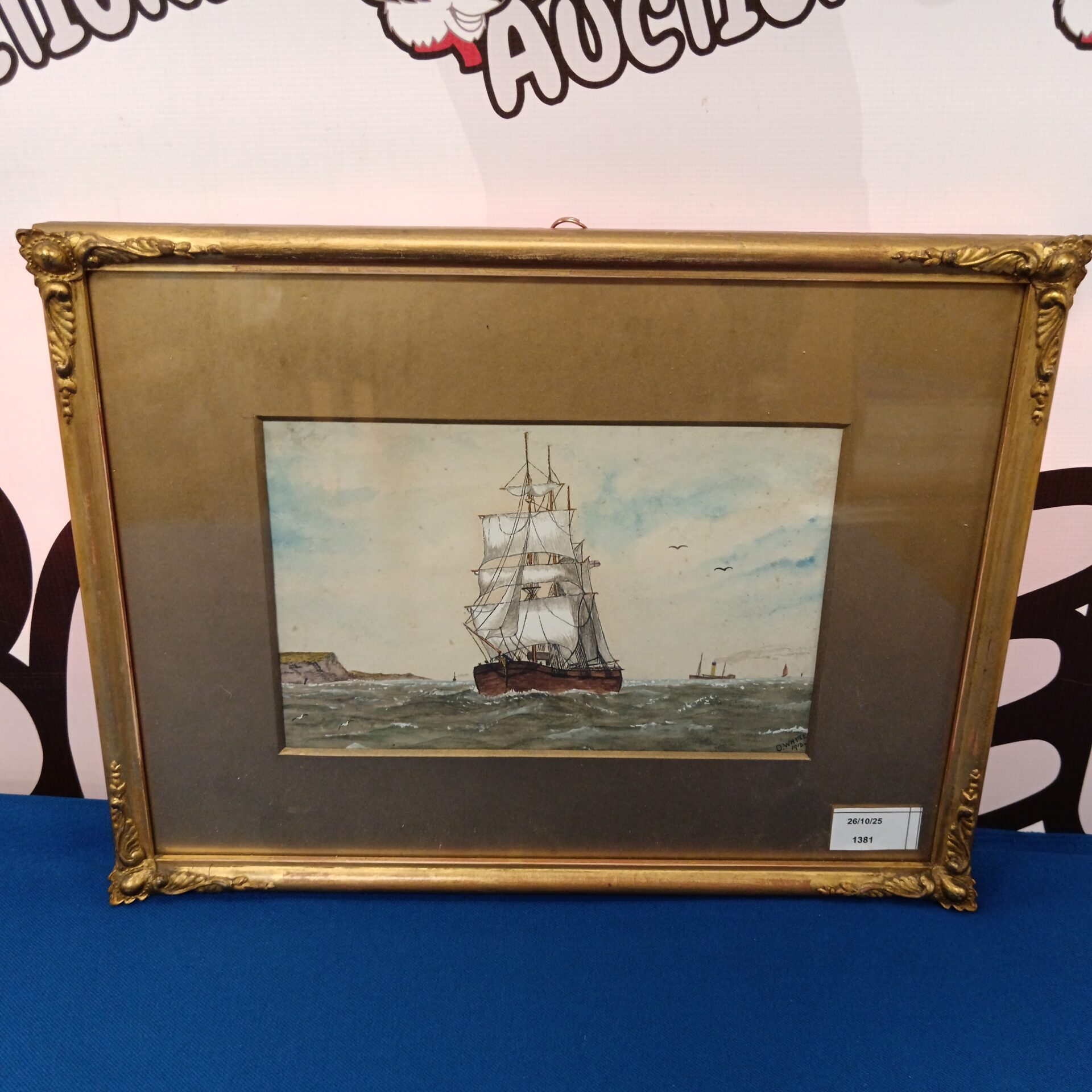 This is a beautiful watercolour painting depicting a three-masted sailing ship alongside a steamship, set against a dramatic coastal backdrop. The artist has skillfully captured the movement of the water and the details of the vessels, creating a captivating maritime scene. The painting is executed with delicate brushwork and a subtle colour palette, evoking a sense of nostalgia and romance.