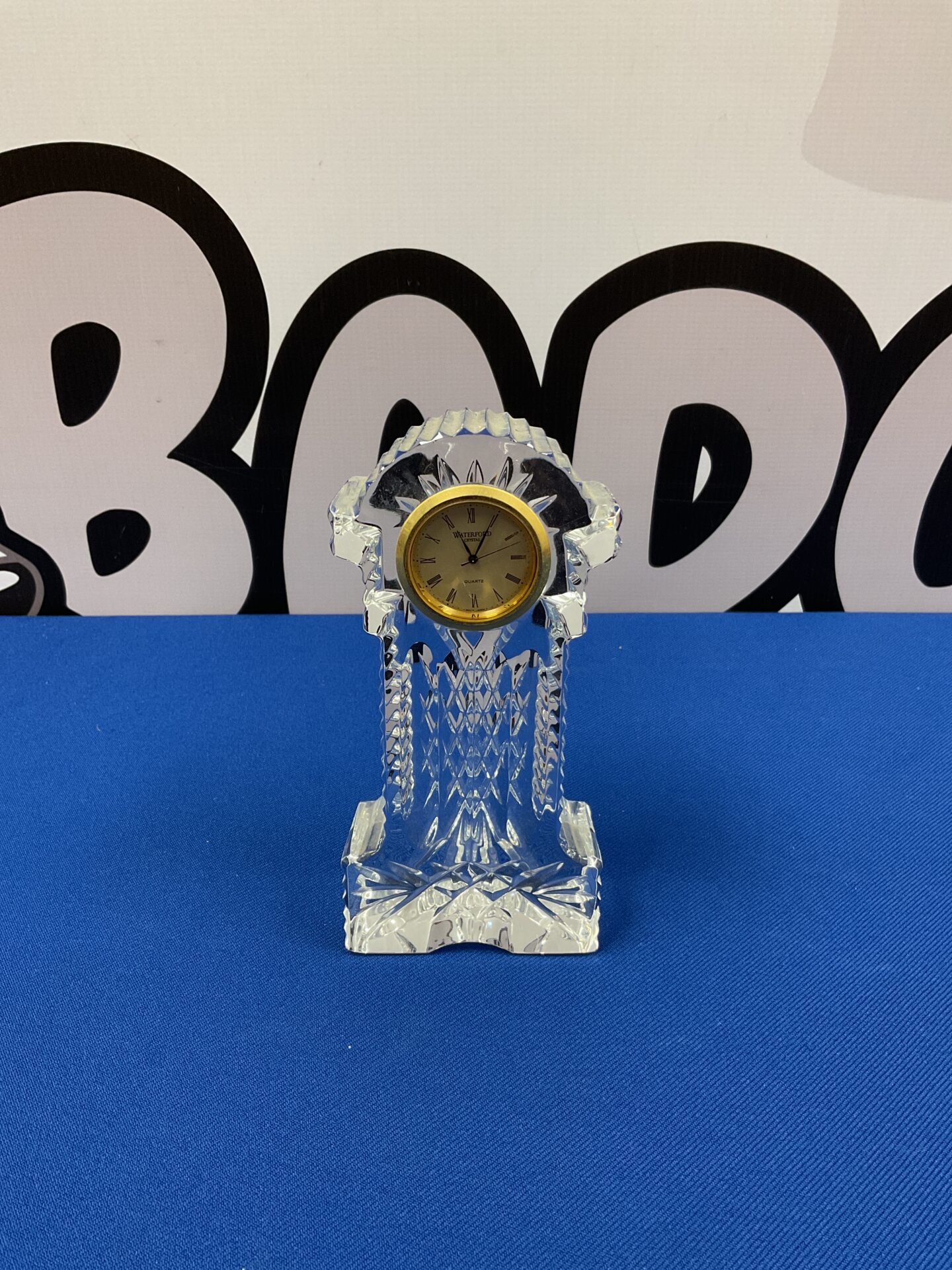 This Waterford crystal clock is a stunning display piece, crafted from clear sculpted crystal. Featuring a quartz movement for accurate timekeeping, this clock adds a touch of elegance to any mantel or shelf. A beautiful addition for collectors or those seeking a luxurious home accent.