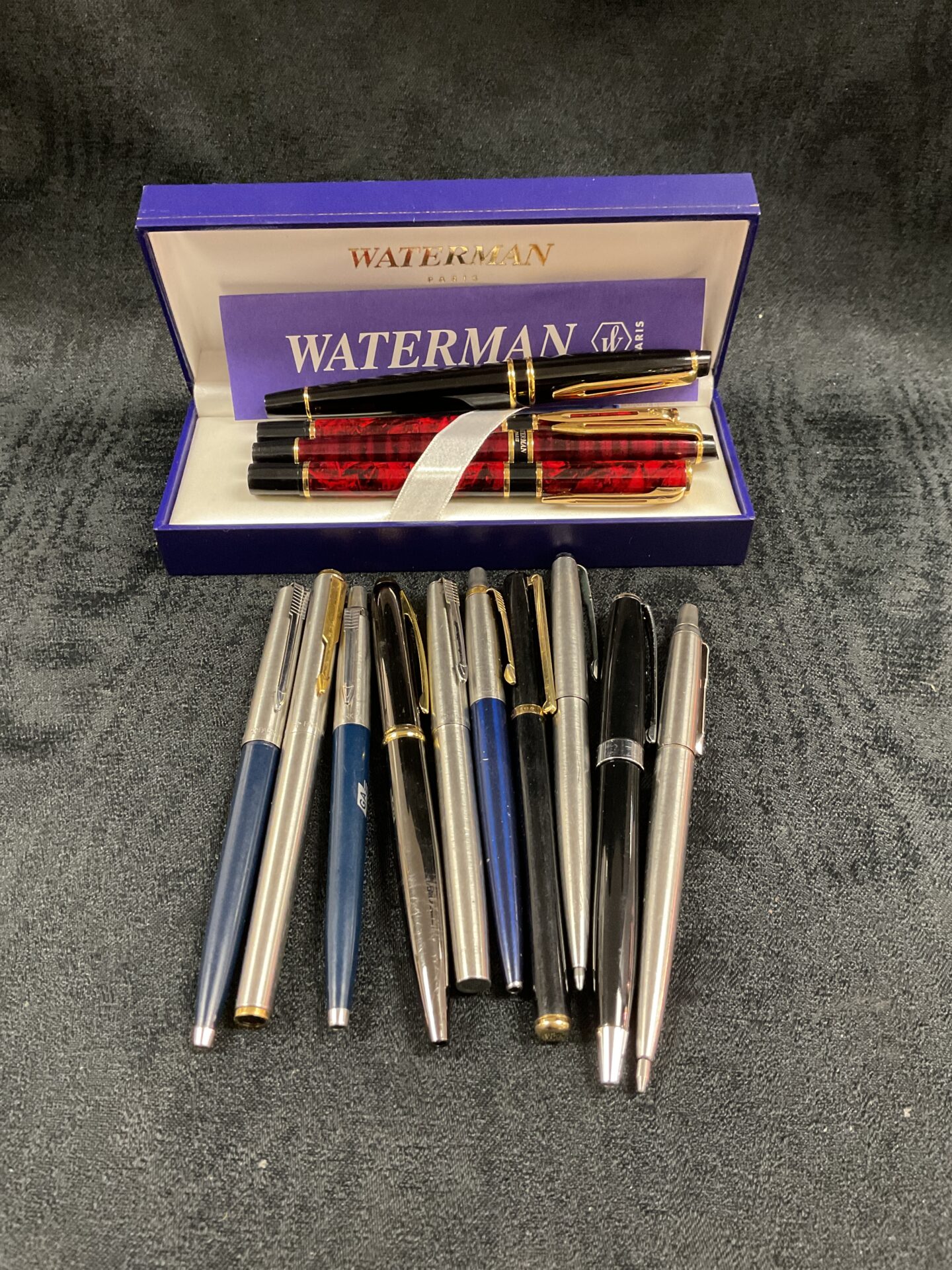This lot comprises a boxed Waterman pen set, alongside a selection of loose pens, including examples from Parker. The boxed set appears to contain multiple pens, presented in a classic Waterman box, suggesting a gift set or a curated collection. The inclusion of Parker pens adds further interest for collectors of vintage writing instruments, offering a variety of styles and potentially different filling mechanisms.