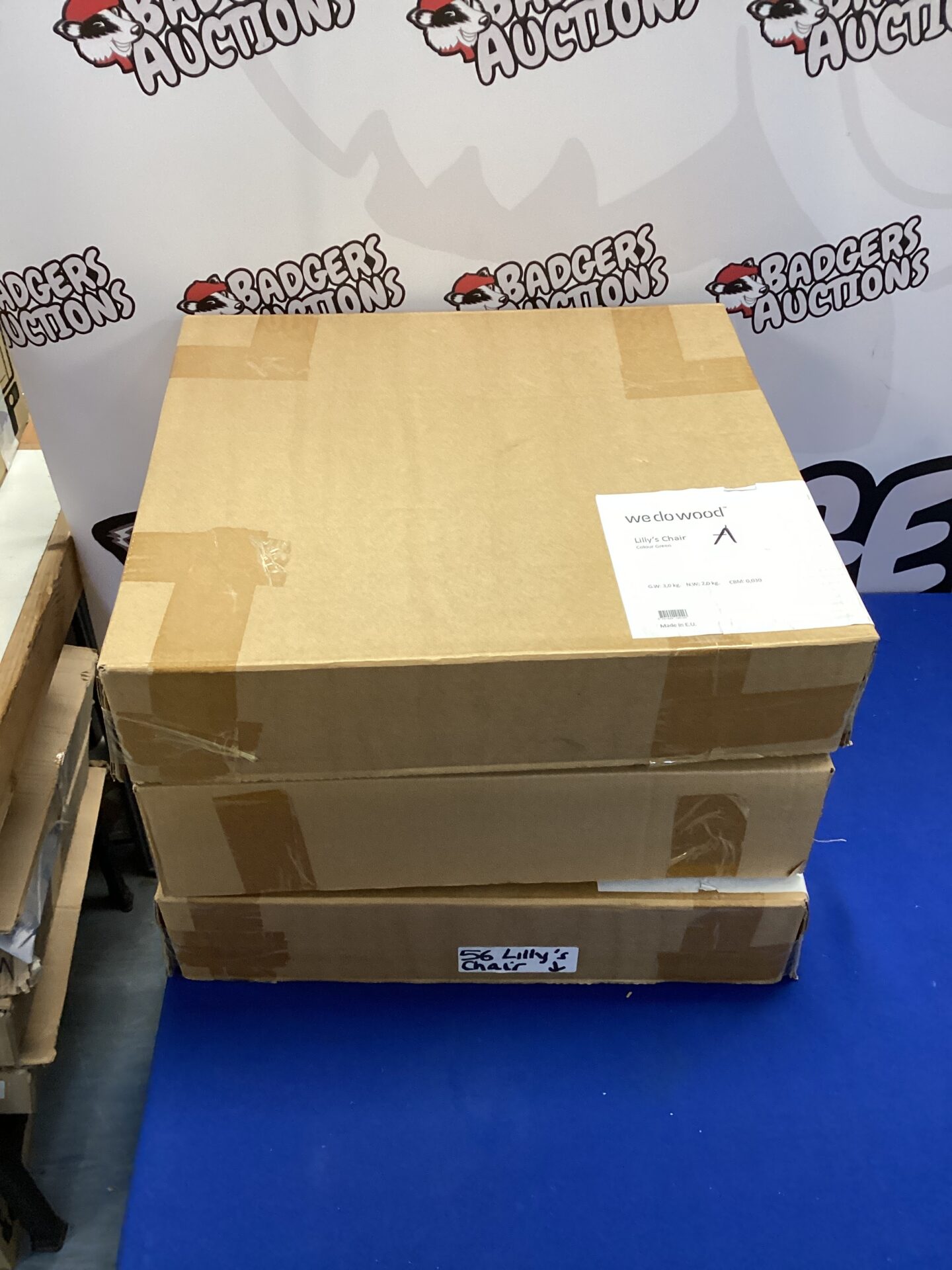 This lot comprises three We Do Wood Lilly chairs, a classic example of mid-century modern design. These chairs are known for their minimalist aesthetic and comfortable moulded plastic seats. Two chairs are finished in a vibrant green, while the third is a light grey, offering a versatile addition to any interior. The iconic design and comfortable form make these chairs highly sought after by collectors and design enthusiasts.