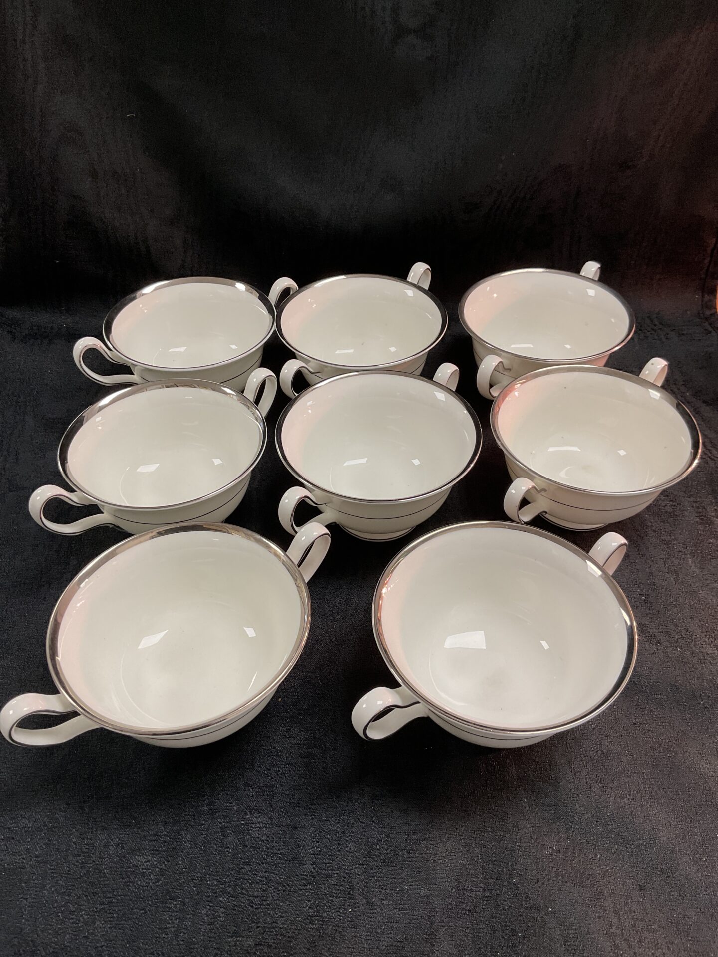 This lot comprises eight Wedgwood Carlyn bone china soup cups. These elegant cups feature a classic white body with a delicate platinum band around the rim. The Carlyn pattern is known for its refined simplicity and timeless appeal, making these cups a sophisticated addition to any table setting. Each cup has two handles for comfortable holding.