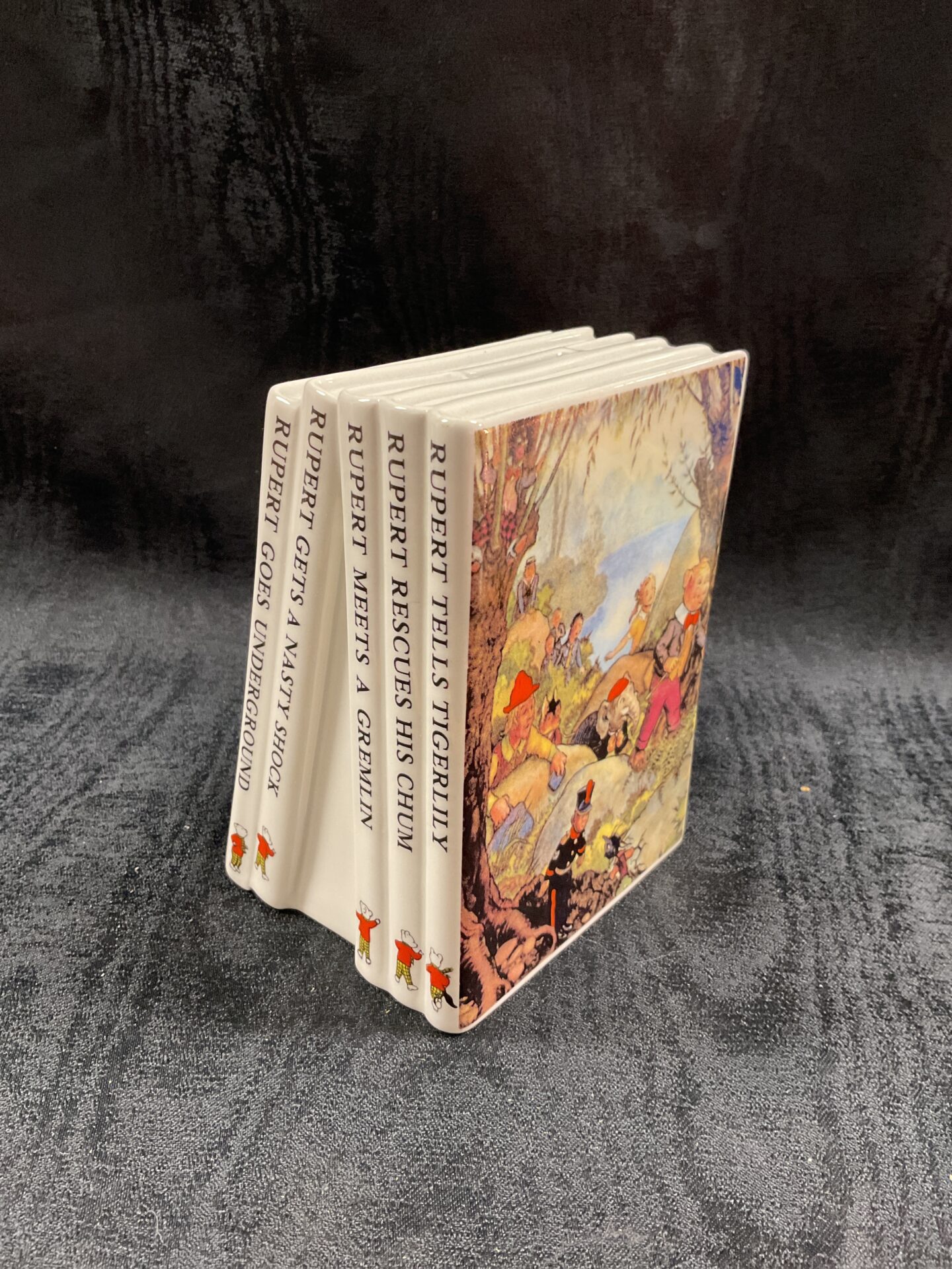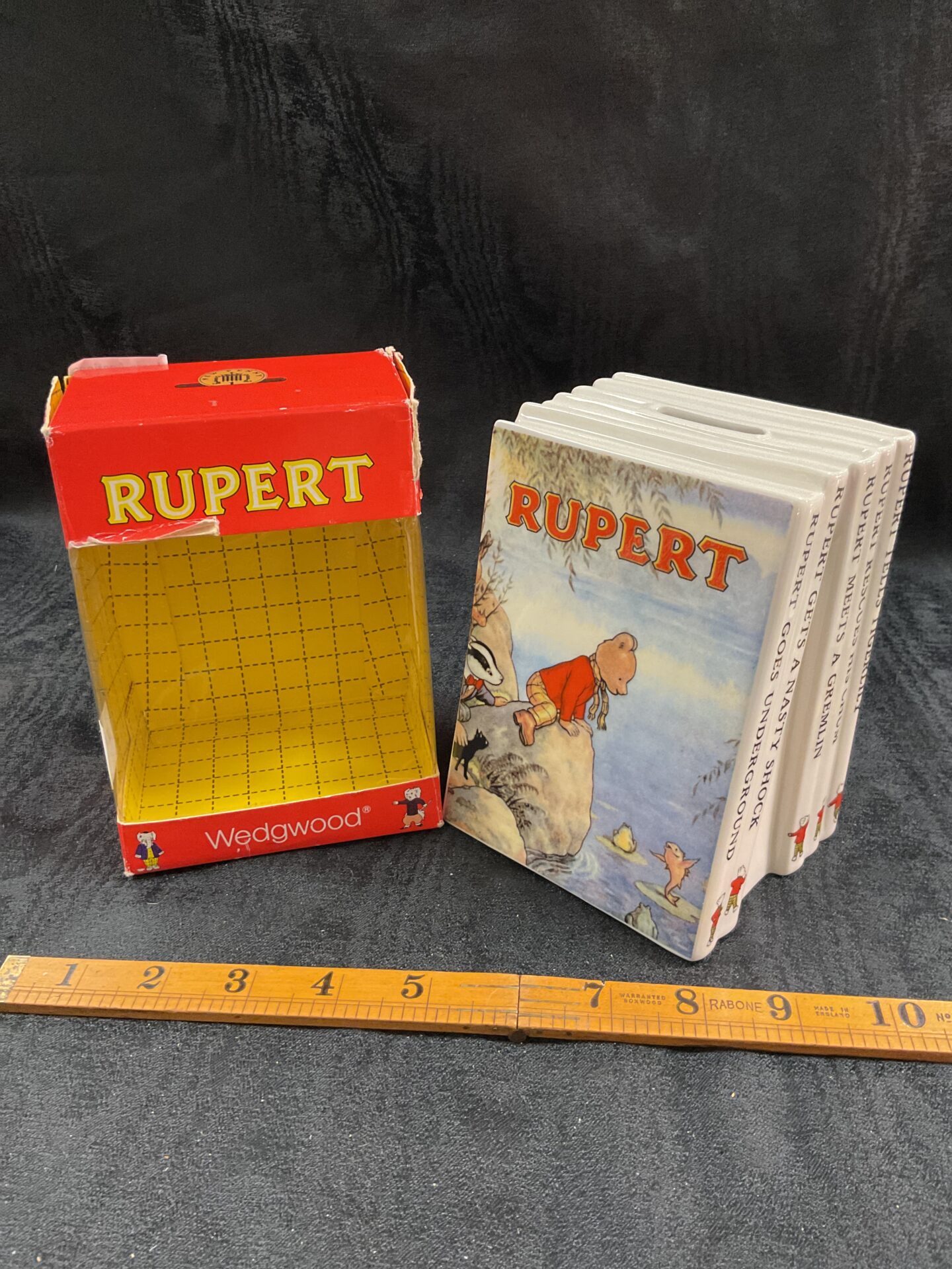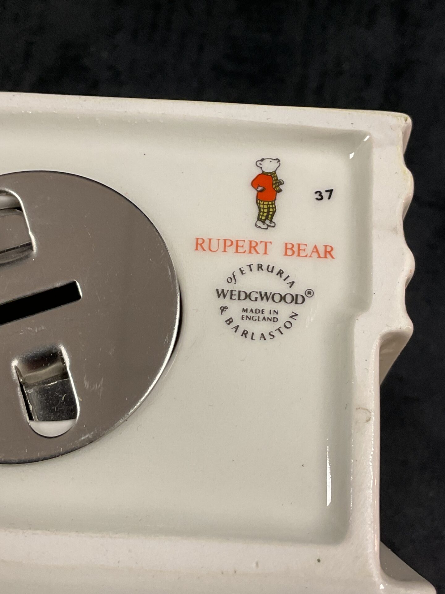 This charming bookend is crafted by Wedgwood, featuring the beloved character Rupert Bear. The design depicts Rupert in a playful scene, and it functions as both a decorative item and a money box. The bookend is marked with the number ’37’ and proudly displays the Wedgwood mark, signifying its quality and heritage.