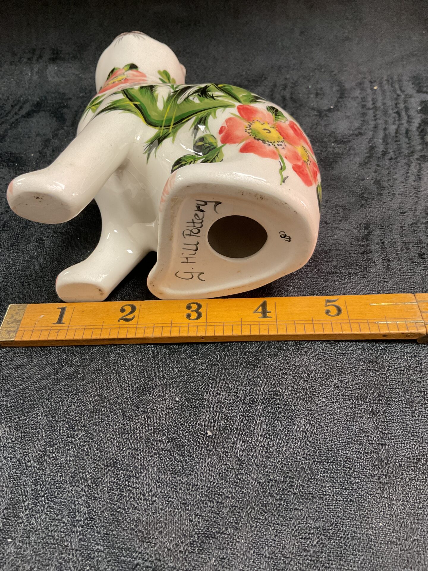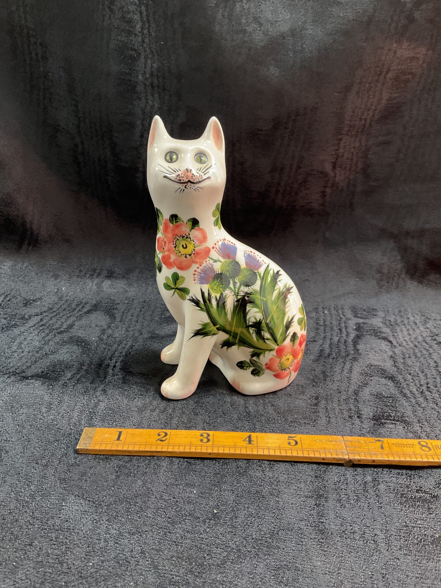 This charming ceramic cat is a delightful example of Wemyss Pottery, hand-painted by the renowned artist Griselda Hill. The piece features a classic cat form adorned with a vibrant floral design, showcasing Hill’s signature style and meticulous attention to detail. The whimsical and colourful decoration, combined with the traditional pottery technique, makes this a truly unique and collectible piece of Scottish artistry.