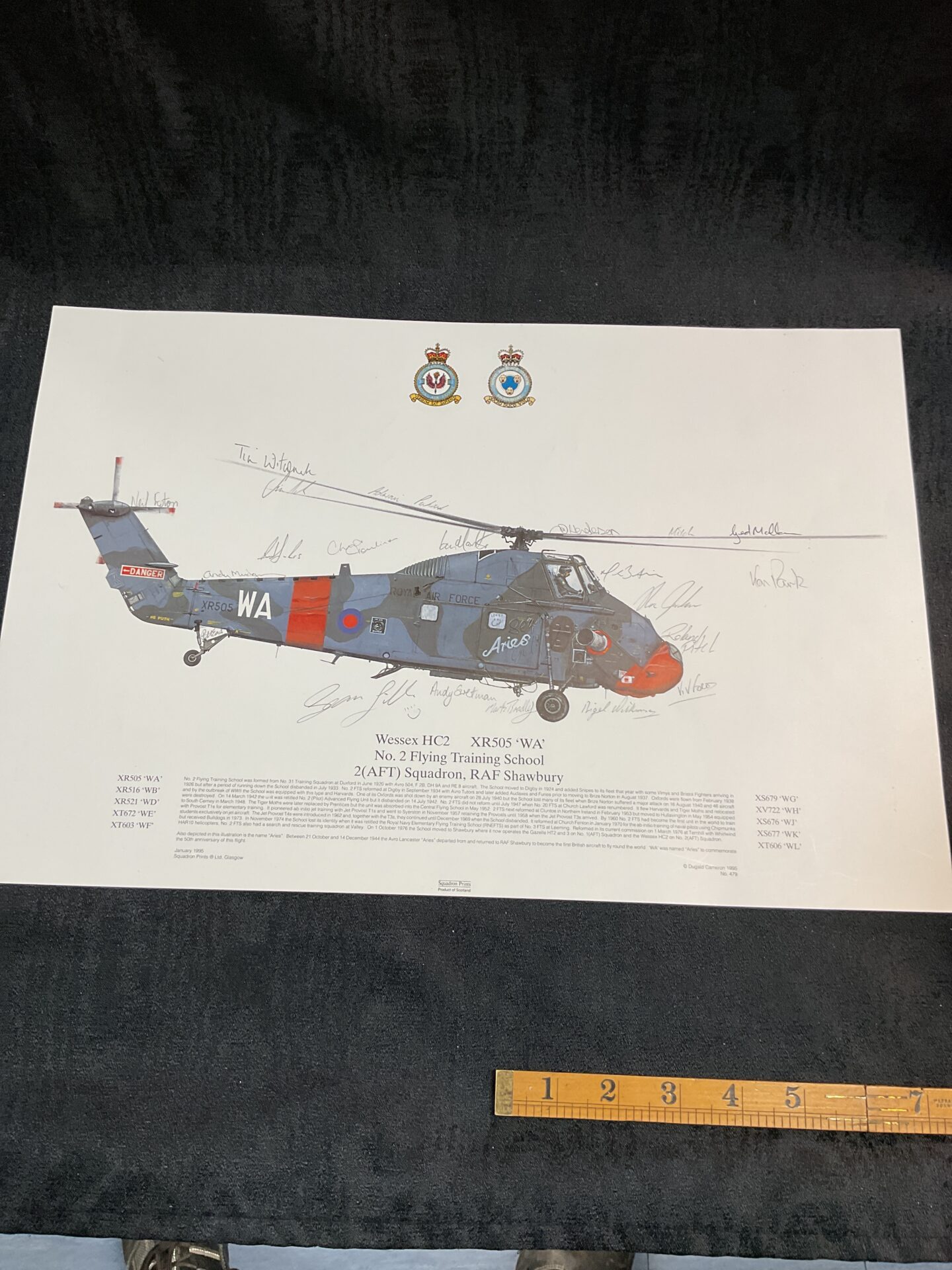 This print appears to be in excellent condition, showcasing vibrant colours and clear detail. It is a highly desirable item for aviation enthusiasts and collectors of military memorabilia, particularly those with an interest in British helicopters. The signatures add significant value and authenticity, making this a unique and sought-after piece.
