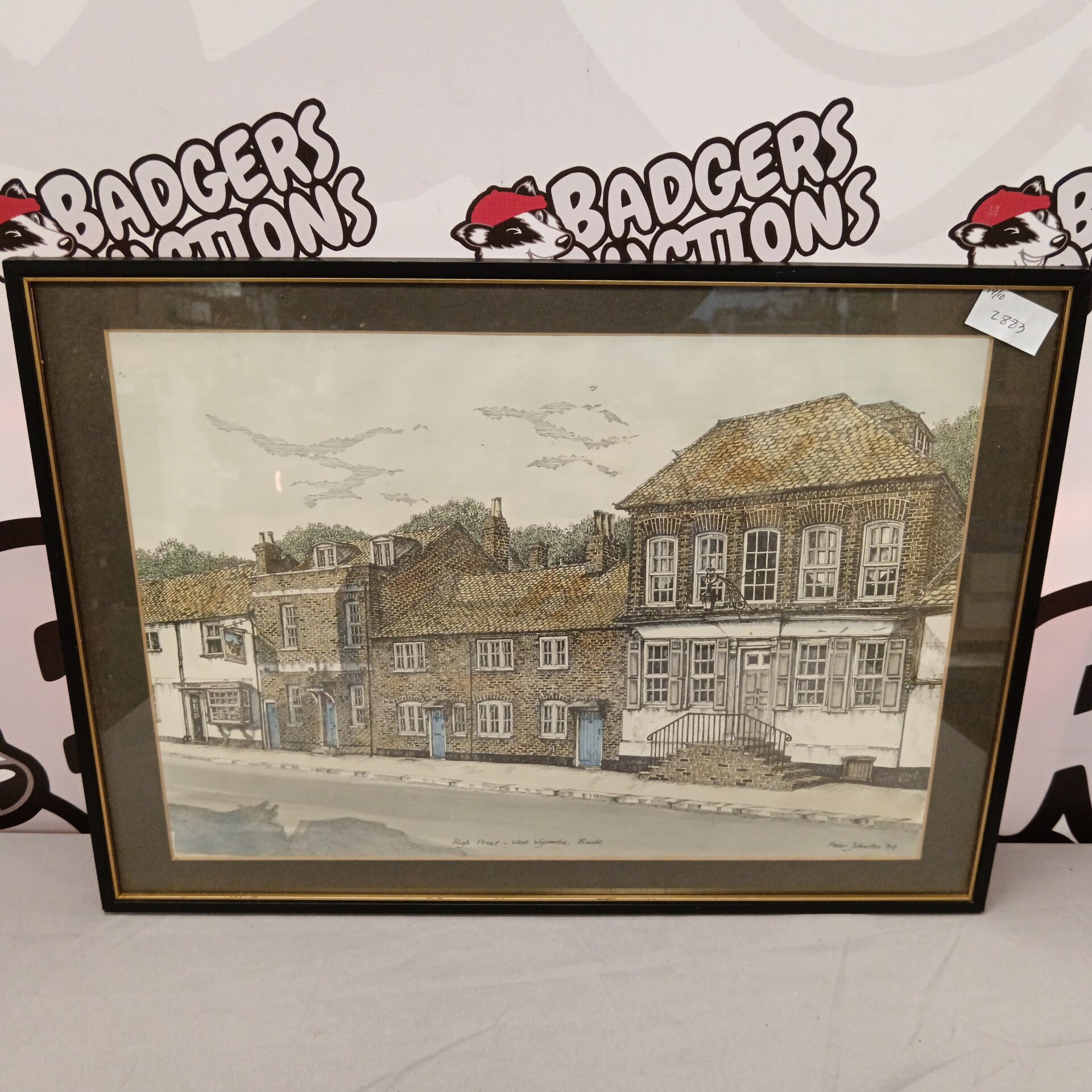 This is a charming framed artwork depicting a historical view of West Wycombe High Street, created by Peter Johnston. The artwork showcases a quaint village scene, capturing the architectural details of the buildings and the atmosphere of the time. It’s a delightful piece that would add character to any room, evoking a sense of nostalgia and rural charm.