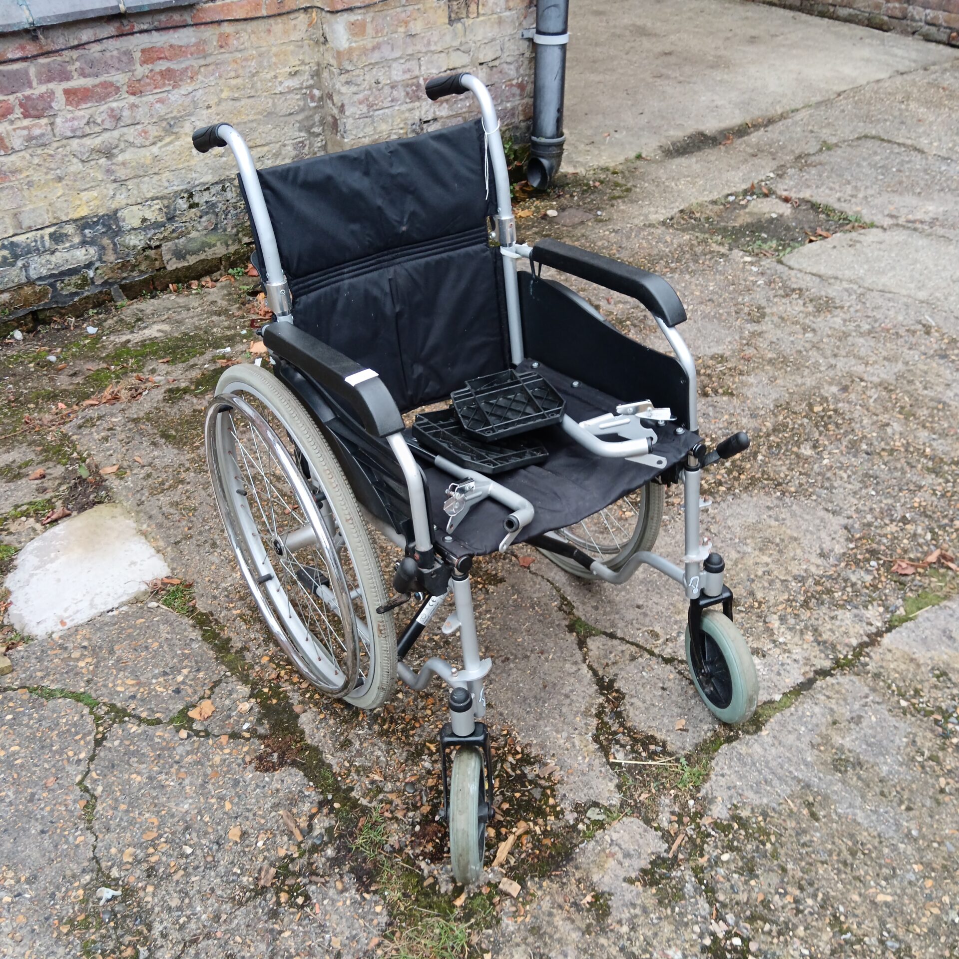 This wheelchair shows signs of previous use and may benefit from cleaning or refurbishment. It is offered in its current condition, and its suitability for use should be assessed by a qualified professional. This wheelchair may appeal to collectors of vintage medical equipment or those seeking a project for restoration.