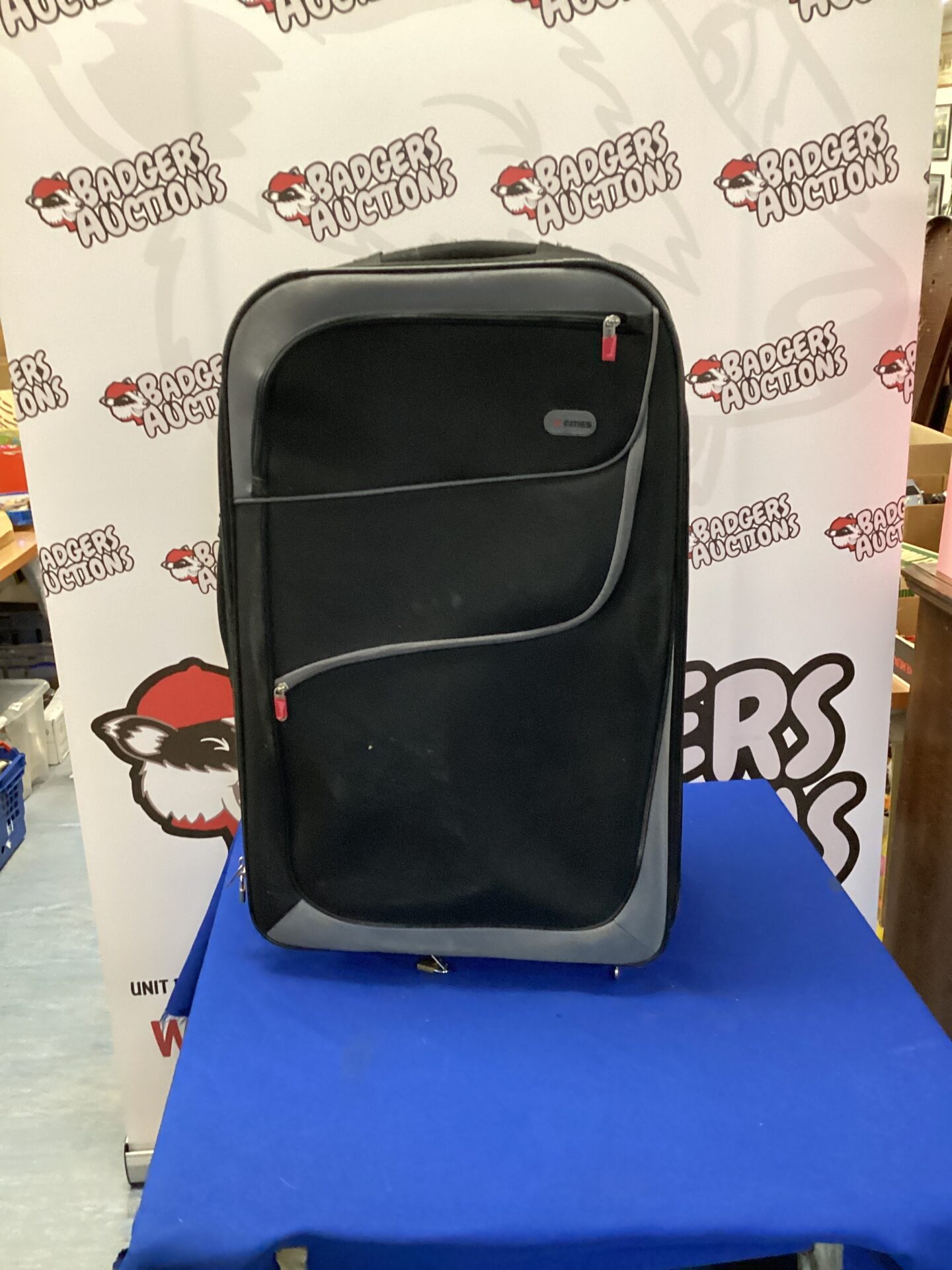 This wheeled suitcase appears to be in good used condition, showing signs of previous travel but remaining fully functional. While not a vintage or rare piece, it represents a practical and reliable travel companion. It would be ideal for someone needing affordable and dependable luggage, or a collector of travel memorabilia seeking a functional piece.