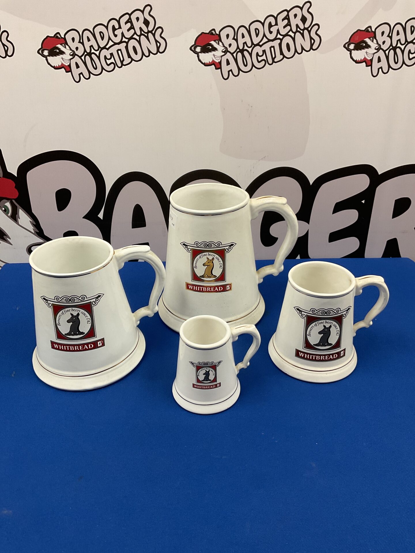 This is a delightful set of four graduated tankards, all bearing the Whitbread Brewery logo. These classic tankards showcase a traditional pub aesthetic, perfect for collectors of brewery memorabilia or those seeking a vintage touch for their home bar. The graduated sizes add a unique element, suggesting they were designed for different beer volumes or serving purposes.