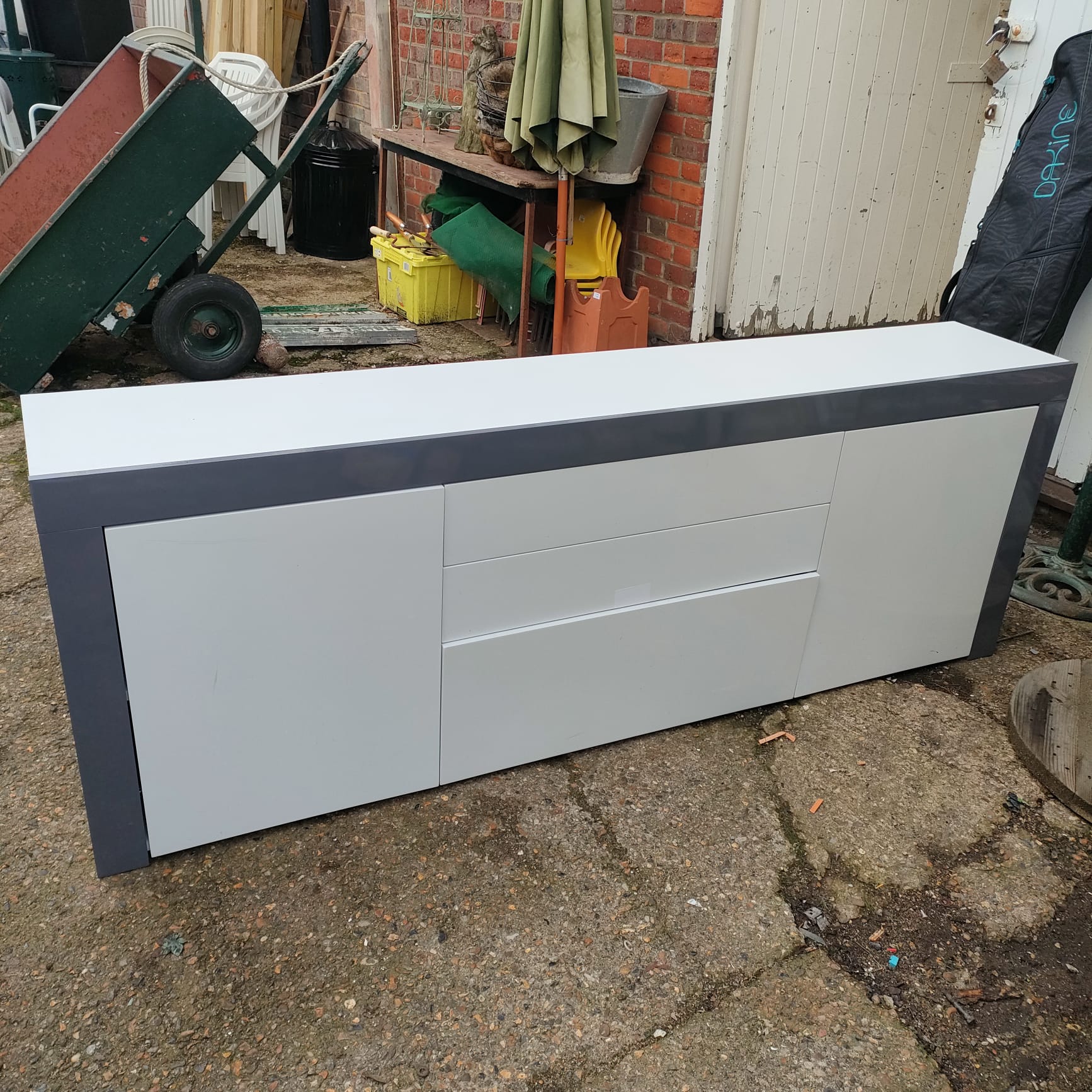 This white and grey side unit offers practical storage with a modern aesthetic. Measuring approximately 79” x 14” x 28”, it’s ideal for bedrooms, living rooms, or hallways. This unit is offered in its current condition, ready for a new home.