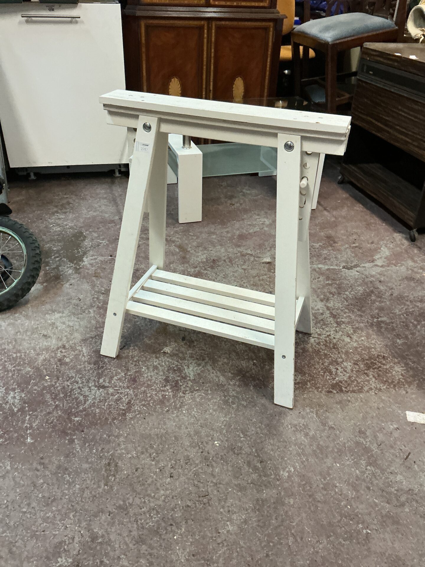 This is a white painted wooden trestle, offering a simple and functional support structure. Constructed from wood, this trestle features a classic A-frame design, providing stability for a tabletop or display surface. Its painted finish gives it a clean, versatile aesthetic that could suit various interior styles.