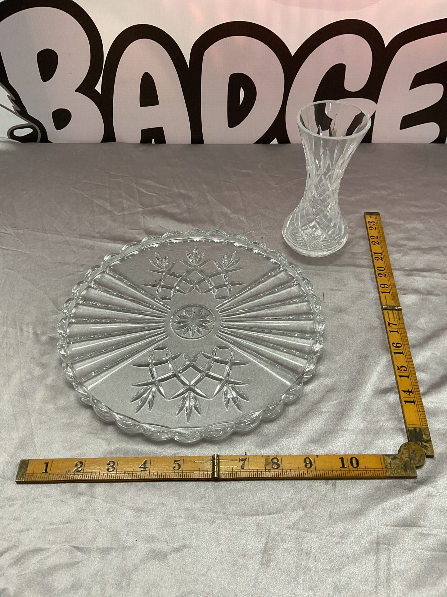 This elegant set comprises a circular lead crystal tray and a smaller coordinating vase, both crafted by Whitefriars. The tray features a beautifully cut geometric pattern, enhancing its visual appeal and providing a luxurious feel. The matching vase echoes the tray’s design, creating a cohesive and sophisticated display. This set exemplifies Whitefriars’ renowned craftsmanship and dedication to quality glassmaking.