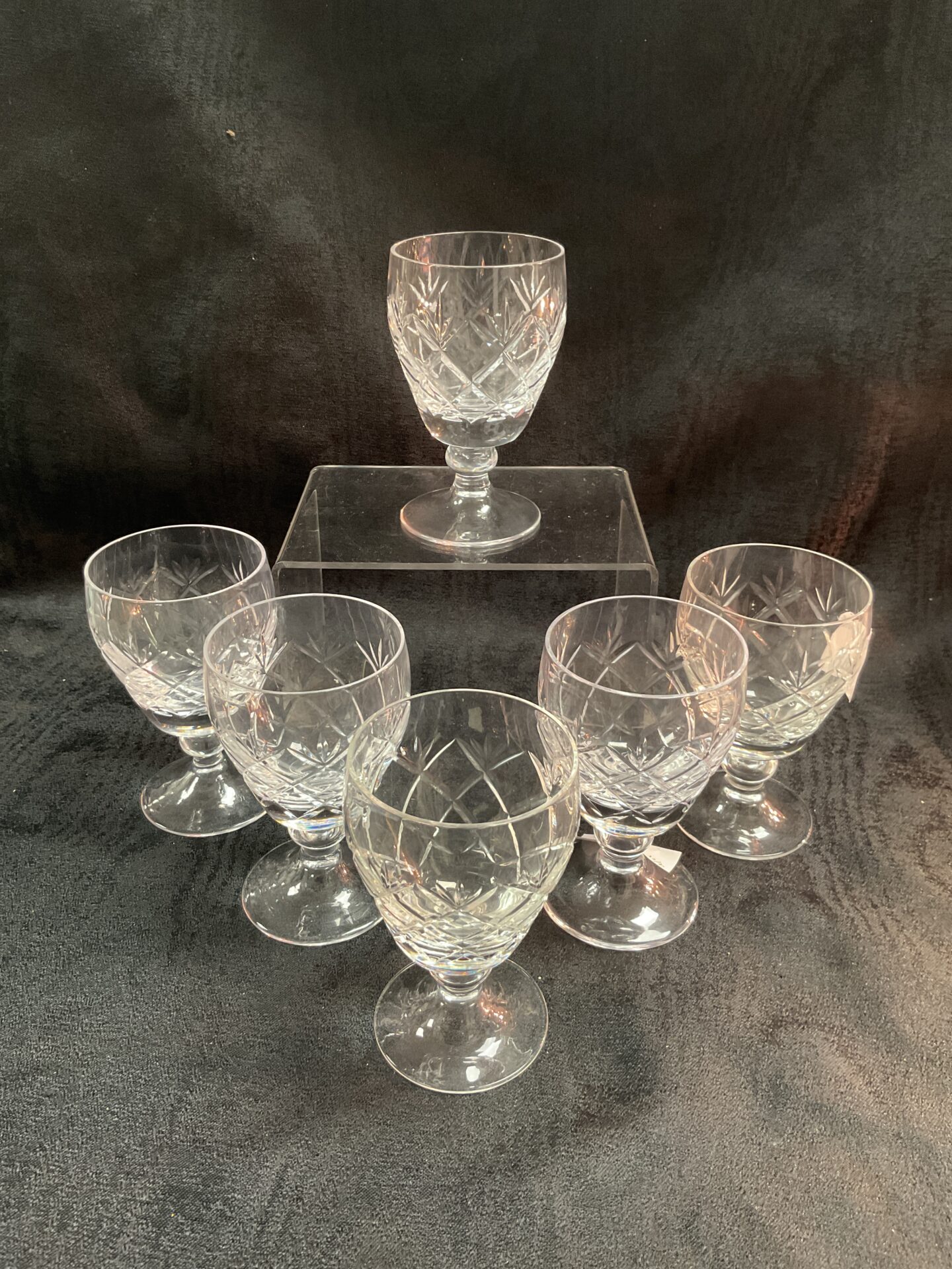 This lot comprises six exquisite Whitefriars crystal wine glasses, showcasing the highly sought-after ‘garland’ pattern. These glasses are beautifully crafted with intricate cut crystal detailing, creating a stunning display of light and texture. The garland design features a delicate arrangement of floral and foliate motifs, characteristic of Whitefriars’ renowned artistry during the mid-20th century. These glasses would have been produced during Whitefriars’ most creative period, and are a testament to their skill in glassmaking.