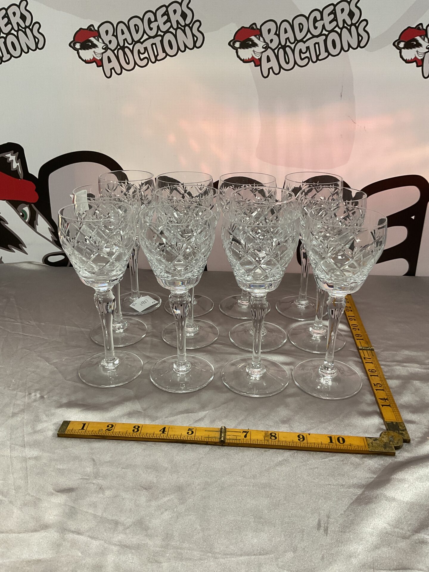 This lot comprises twelve exquisite Whitefriars crystal wine goblets. These goblets showcase the renowned craftsmanship of Whitefriars, a British glassmaking company celebrated for its innovative designs and high-quality crystal. The delicate stems and beautifully shaped bowls exemplify the elegance and sophistication associated with Whitefriars glassware, making them ideal for both display and use.