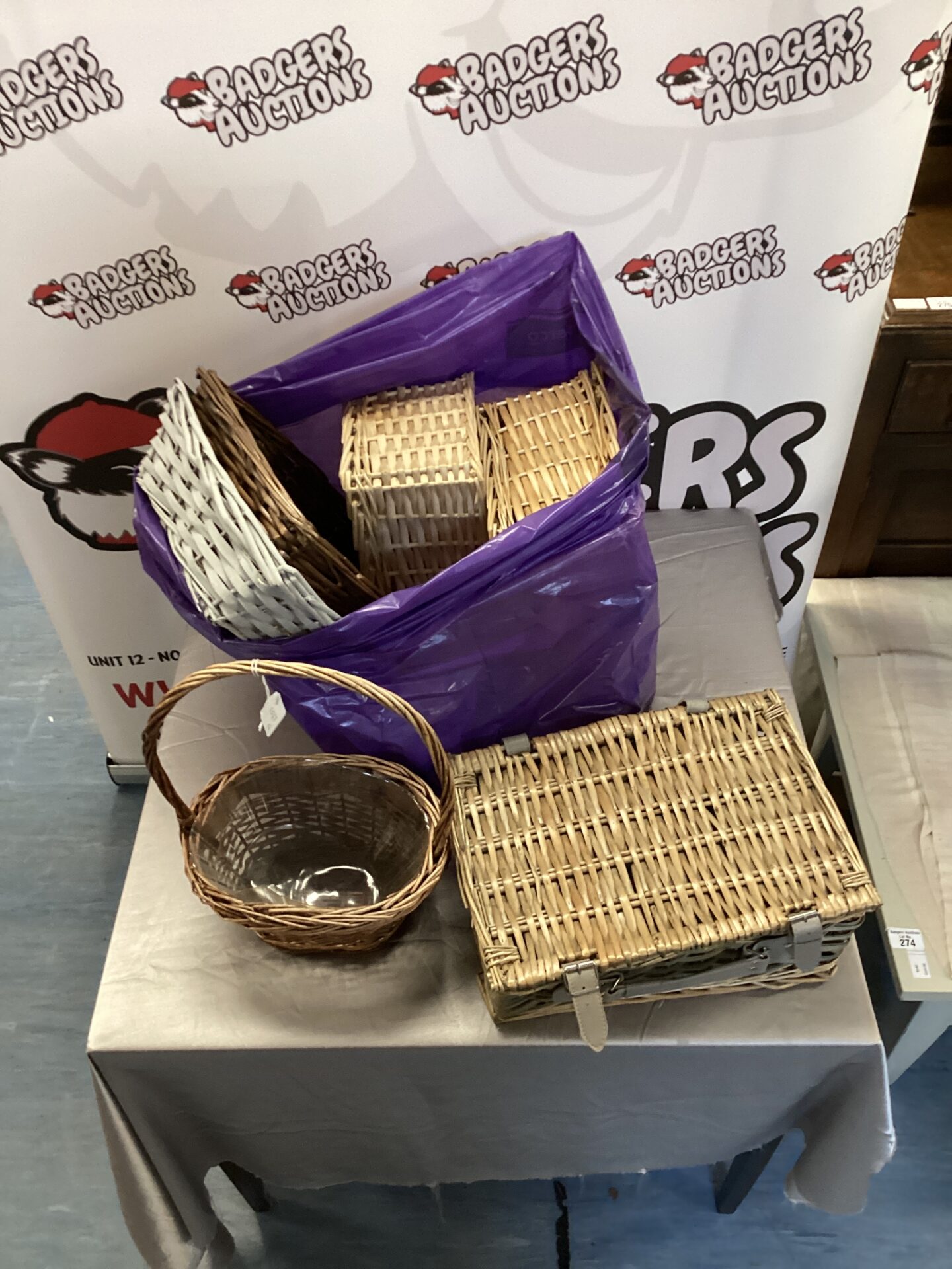 This lot comprises a collection of wicker baskets, varying in size and shape. The baskets appear to be handwoven, exhibiting a traditional style suitable for storage or decorative purposes. Their natural material and woven construction lend a rustic, farmhouse aesthetic.