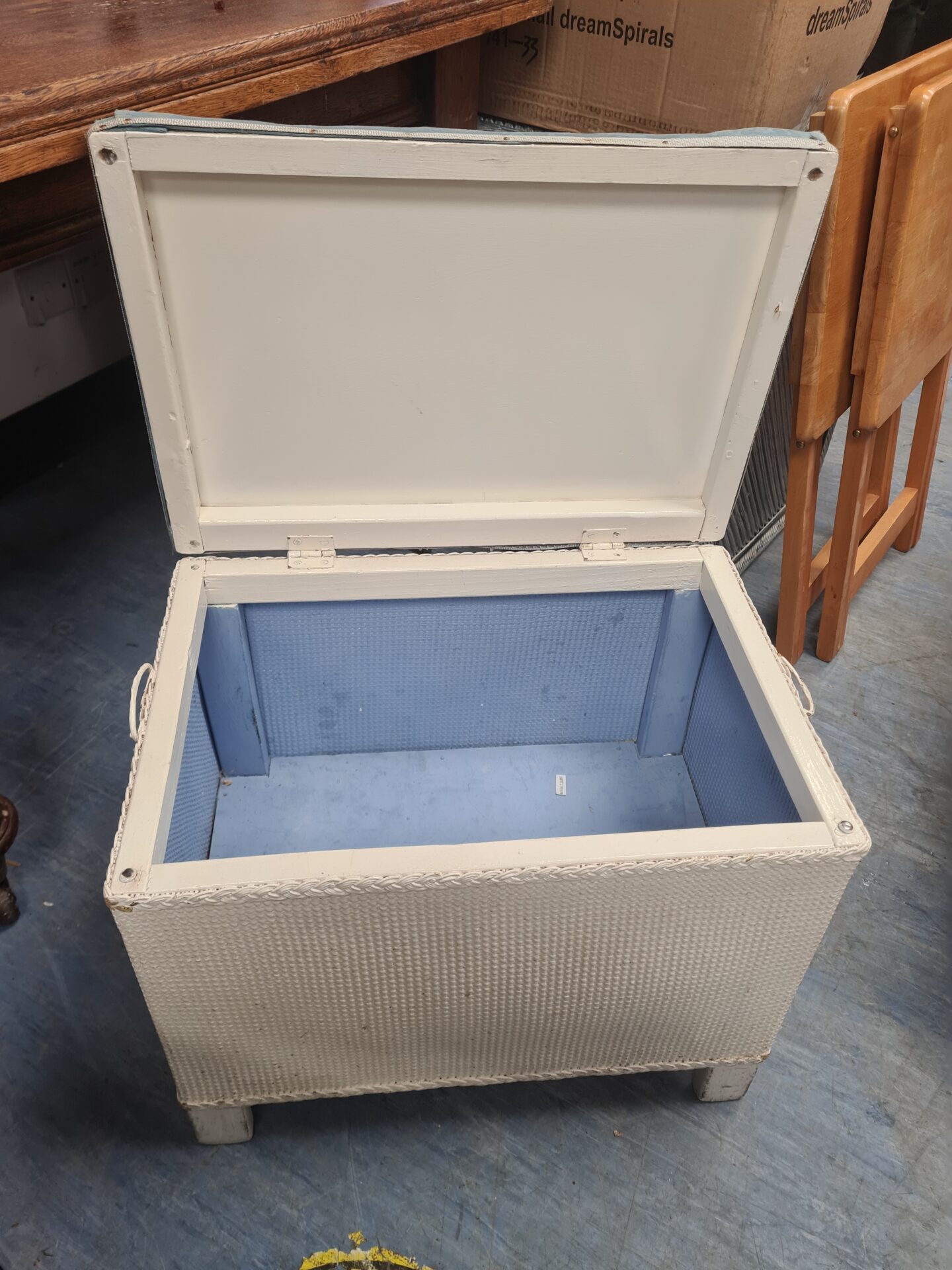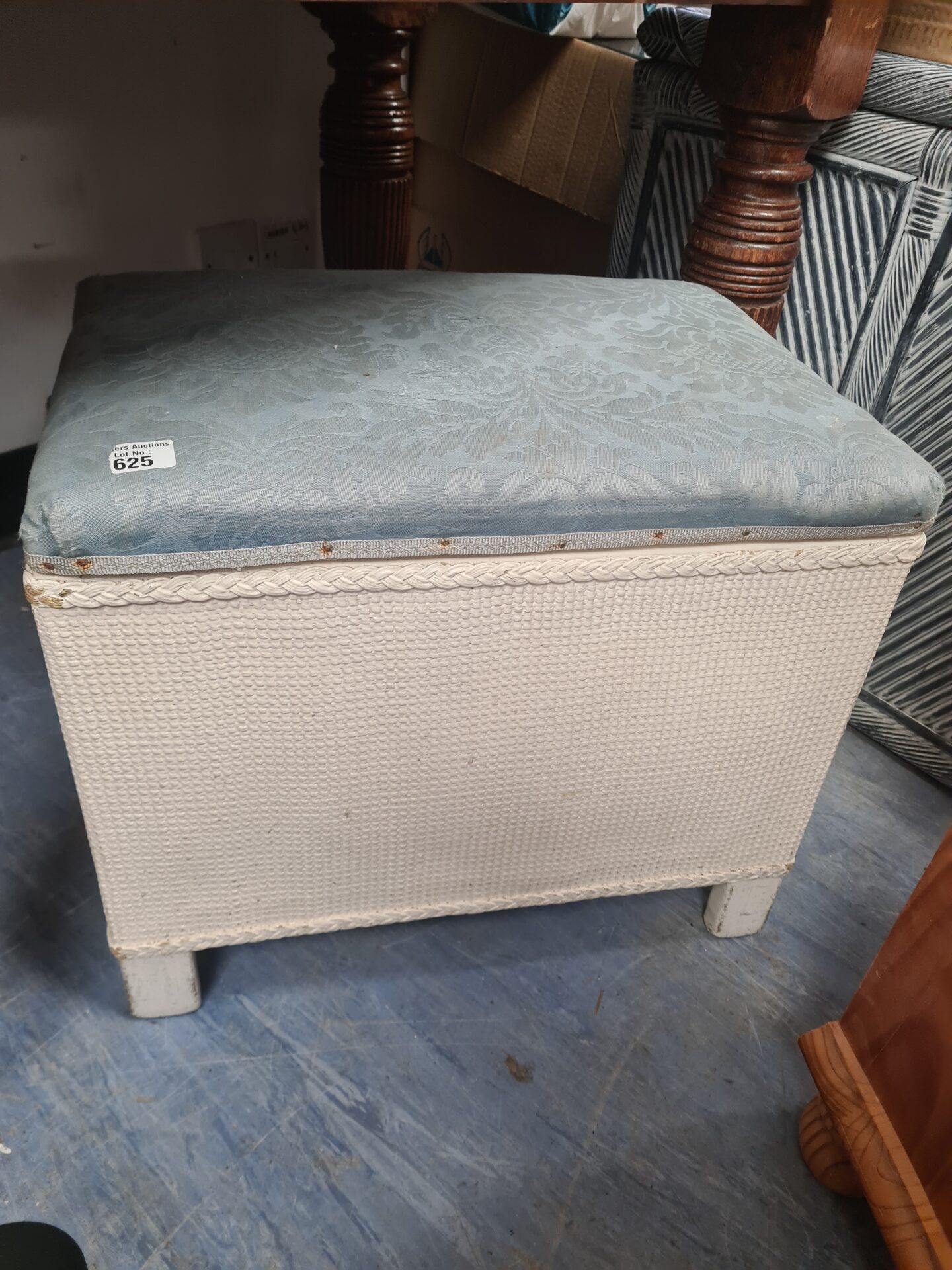 The footstool shows signs of wear consistent with age and use, adding to its character. The wicker remains intact, though some minor imperfections may be present. The fabric cushion is in good condition, with some fading or wear. This piece would appeal to collectors of vintage home decor or those seeking a unique and functional addition to their home.
