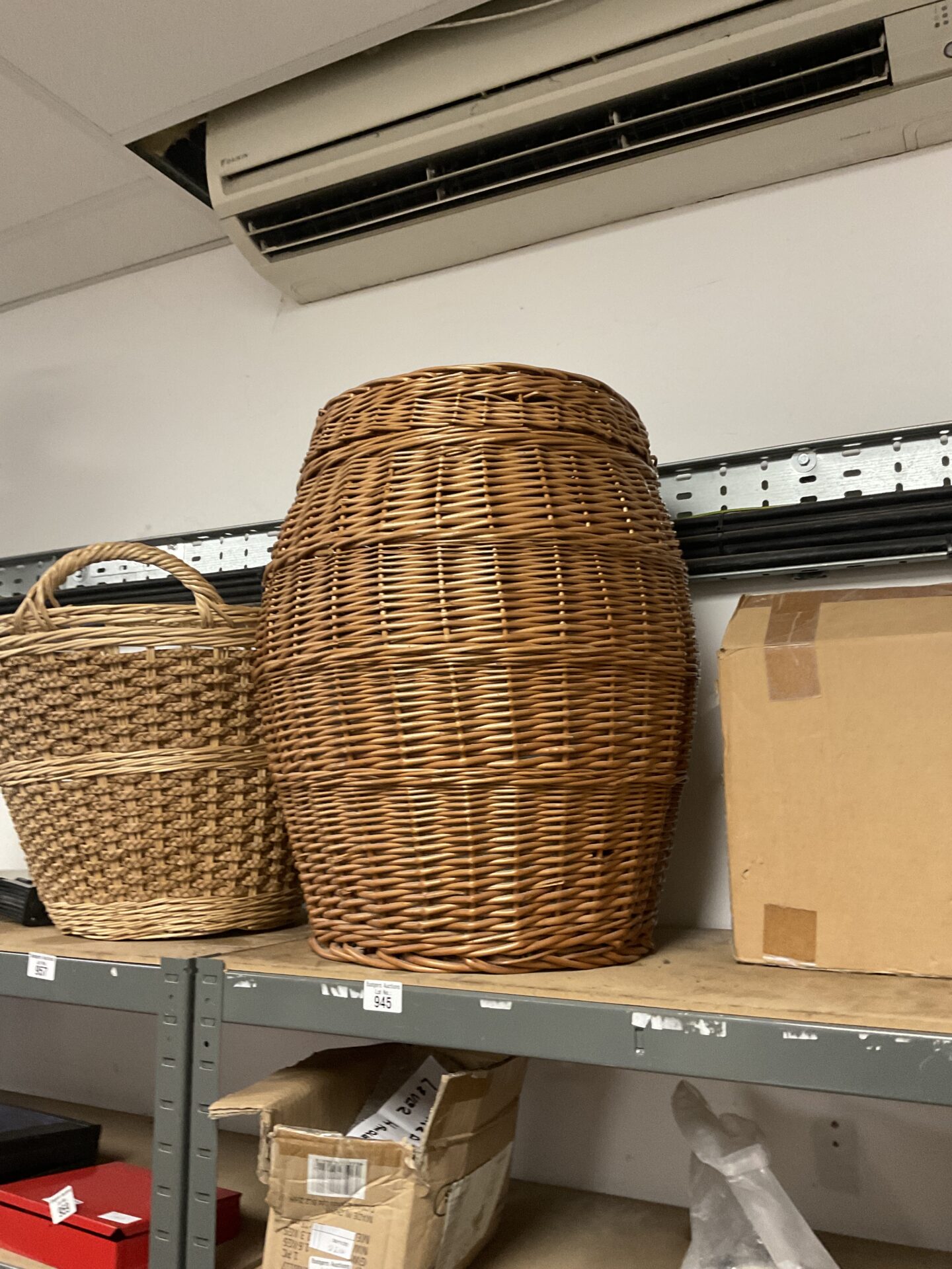 This basket shows signs of age and use, with some wear and minor imperfections to the wicker. These imperfections contribute to its vintage charm and character. It would be a welcome addition to a farmhouse-style home or a collector of vintage laundry items, offering both functionality and a touch of nostalgic appeal.