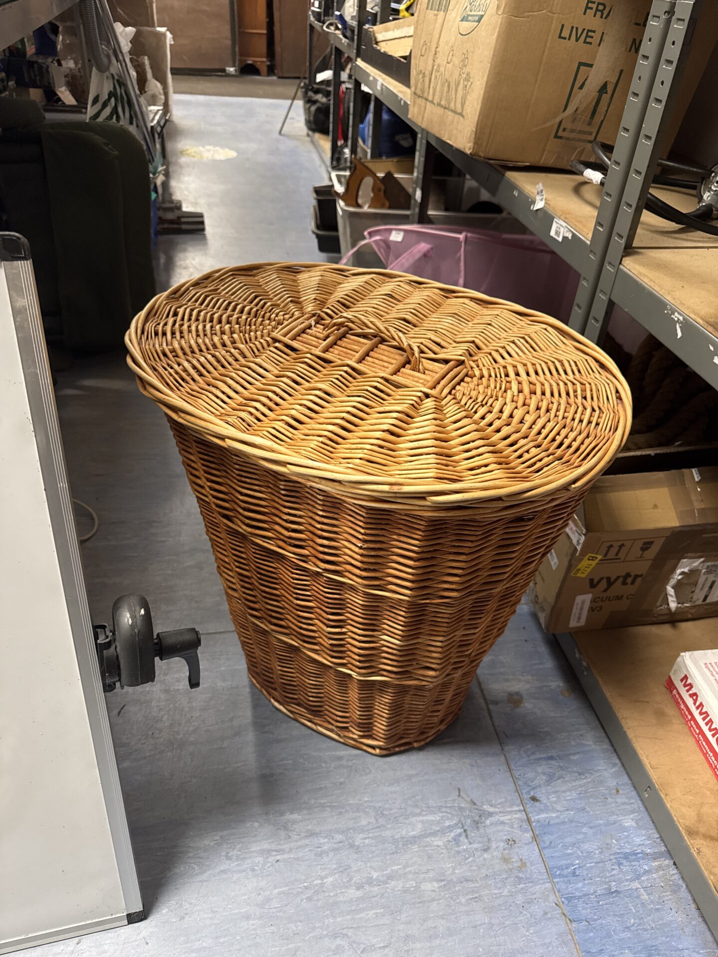 This laundry basket shows signs of use and wear consistent with age. The wicker shows some fading and minor imperfections, adding to its character. It would appeal to collectors of vintage home goods or those seeking a farmhouse-style aesthetic for their laundry room or bedroom.