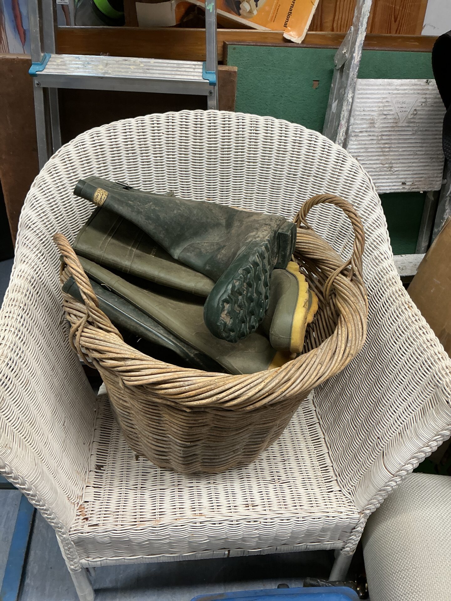 The basket shows signs of age and use, with some wear to the wicker, which is typical for a vintage item. The wellington boots are included as they are pictured, but their condition is not specifically assessed. This combination of rustic charm and practical use makes it appealing to collectors of farmhouse decor or those seeking a functional and decorative item for a country home.