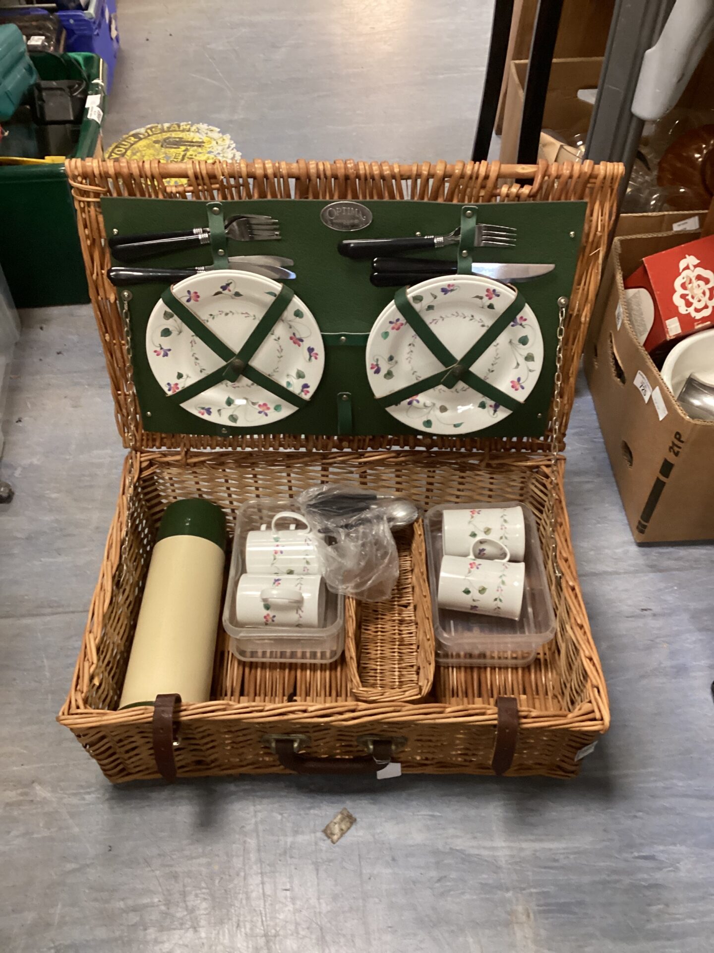 The picnic basket appears to be in good vintage condition, with expected wear consistent with age and use. While there may be minor imperfections to the wicker or slight wear to the melamine, these only add to its character and authenticity. This complete set is a desirable find for collectors of vintage picnic ware or those seeking a functional and stylish way to enjoy outdoor dining.