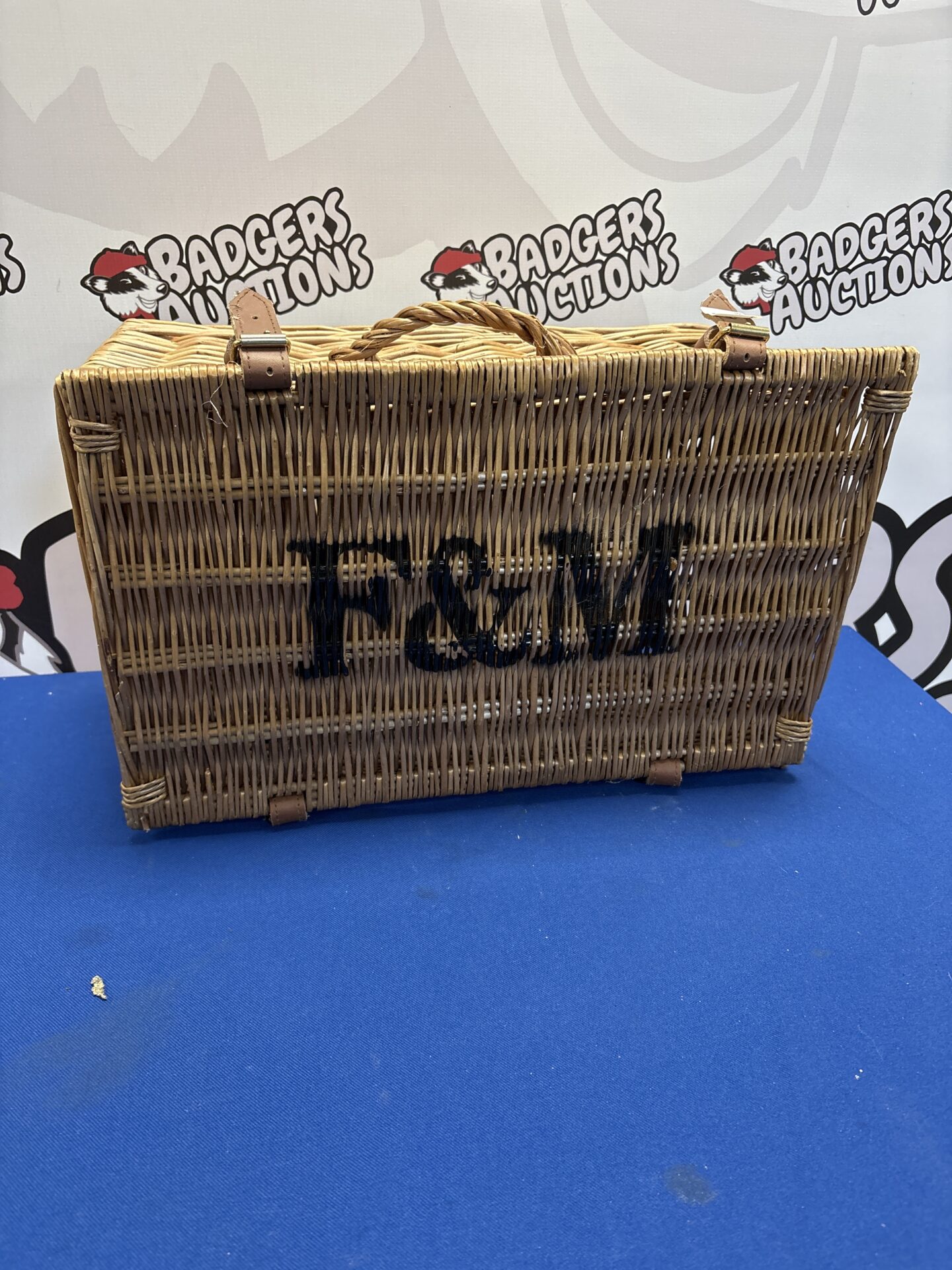 This is a charming wicker storage basket, likely from F&M. The basket features a traditional woven construction, offering a rustic and timeless aesthetic. Its sturdy build suggests it was designed for practical use, while its attractive appearance makes it suitable for display as well.