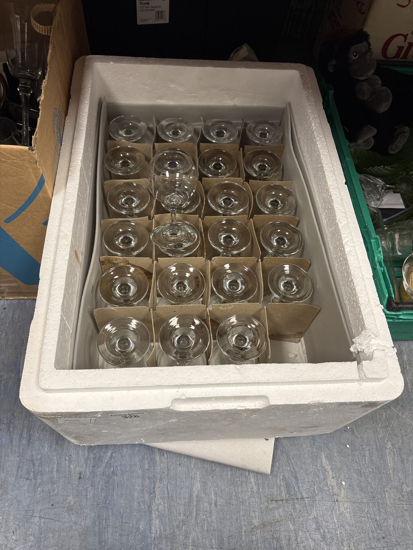 This lot features a box of twenty-four wine glasses, ideal for parties or events. The glasses are presented in protective polystyrene packaging. They are sold as found, and individual condition is not fully visible.