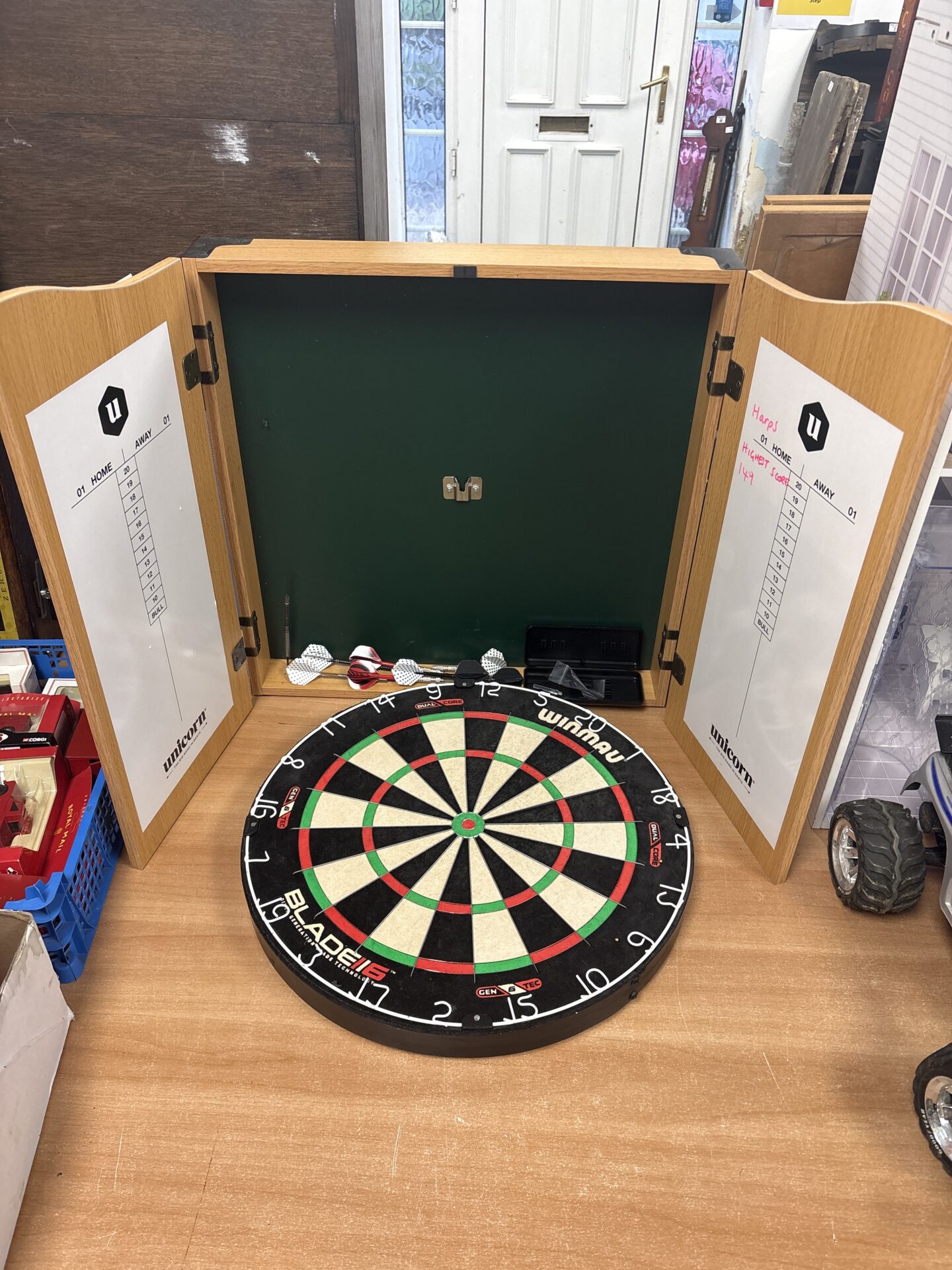 The dartboard and case show signs of use, consistent with age and play. It is presented as viewed in the images, and may require cleaning or restoration. This item may appeal to dart enthusiasts, collectors of vintage games, or those seeking a classic pub-style entertainment piece.