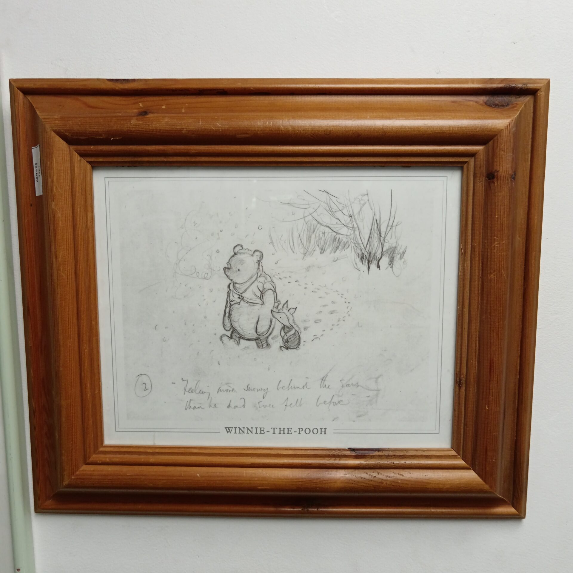 The print shows signs of age and wear, consistent with its vintage nature. There may be minor imperfections or fading, adding to its character. This piece is of interest to collectors of Winnie the Pooh memorabilia, vintage prints, or those seeking charming and nostalgic home decor. It offers a touch of whimsy and classic storytelling to any space.