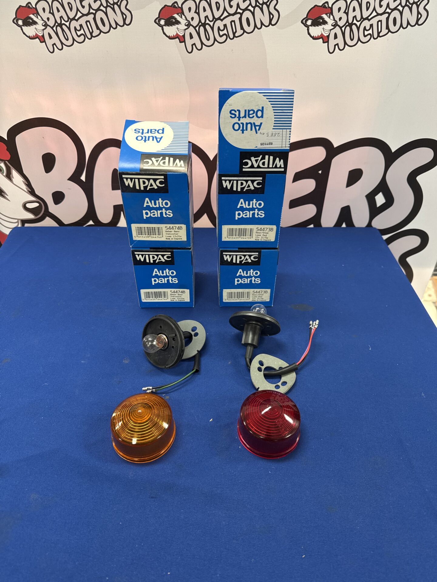 This lot comprises four Wipac rear light assemblies, consisting of two amber indicator lamps (part number S4474B) and two red stop lamps (part number S4473B). These assemblies appear to be designed for classic vehicles, offering a vintage aesthetic. The construction features a robust plastic housing, typical of Wipac’s automotive lighting products.