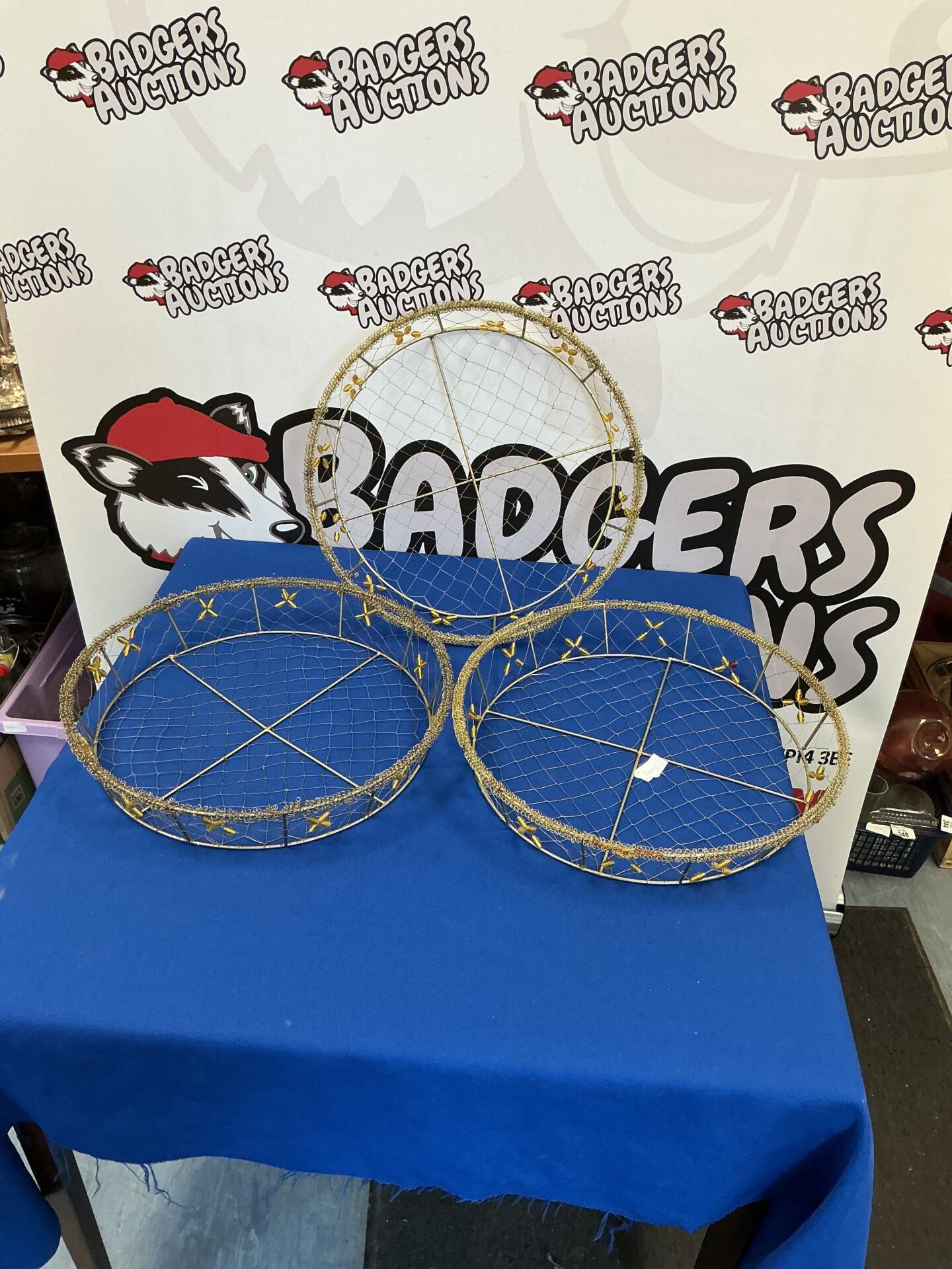 This lot comprises three charming wire display baskets, likely dating from the mid-20th century. Constructed from sturdy metal wire, these baskets feature a circular frame with a woven wire base, creating an open and airy design. Their simple yet effective construction suggests they were originally intended for retail display, perhaps showcasing small goods or produce, but they would also make excellent decorative pieces.