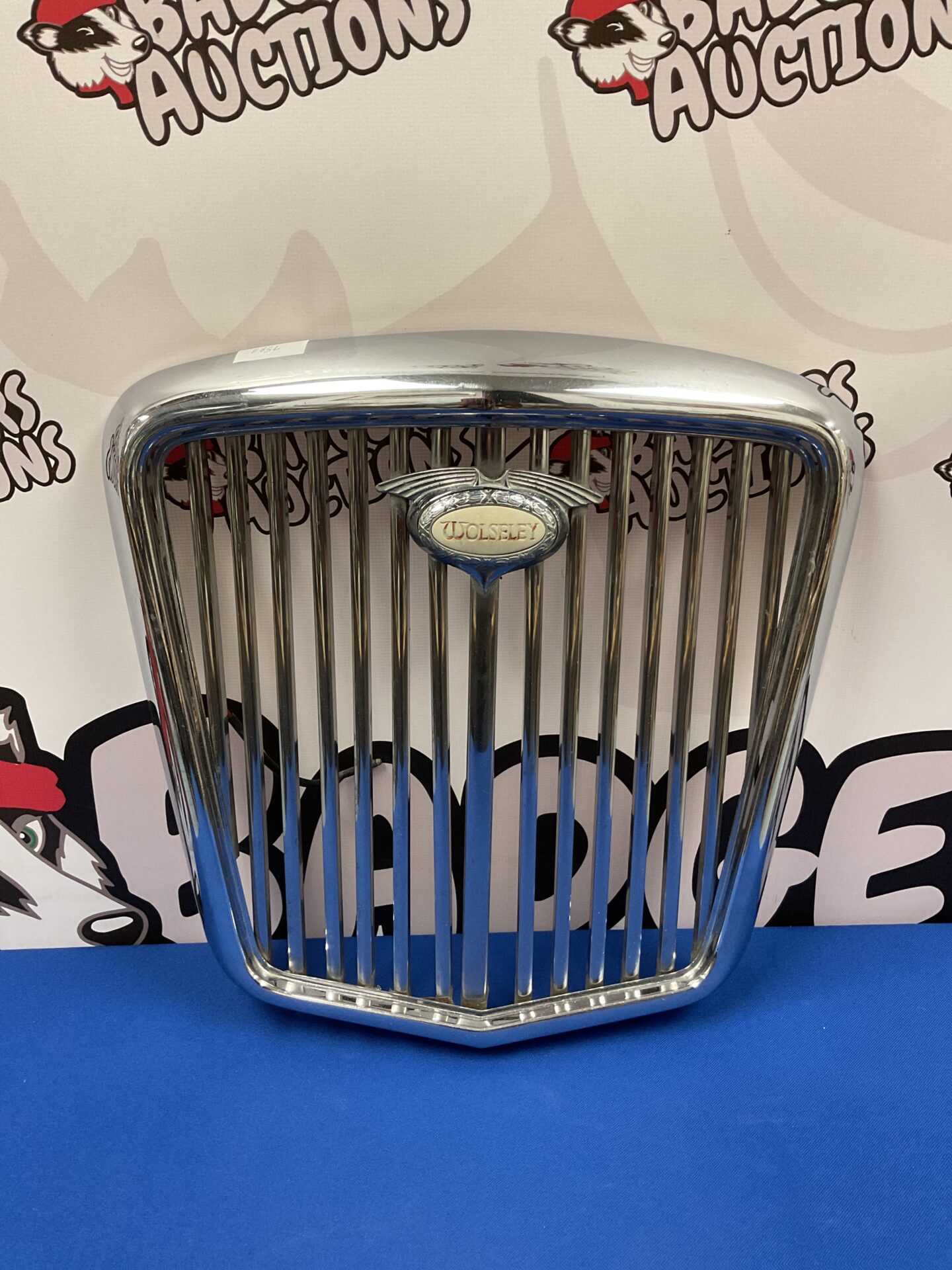 This is a classic Wolseley car grill, a prominent feature of the vehicle’s front end. The grill exhibits a polished chrome finish and a distinctive vertical slat design, typical of Wolseley automobiles. This grill would have originally been mounted to the front of the vehicle, serving both a functional purpose of allowing airflow to the radiator and an aesthetic one, contributing to the car’s overall appearance.