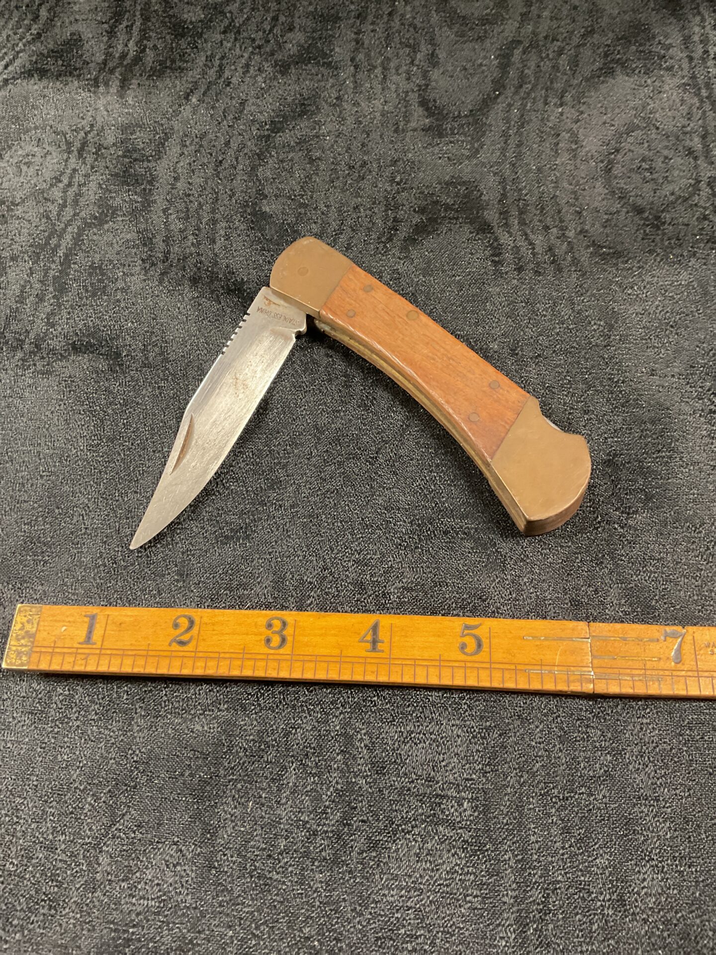 This vintage pocket knife boasts a beautiful wood handle and a stainless steel blade. A classic design, it’s perfect for collectors or everyday use. This functional and stylish knife shows signs of wear consistent with age, adding to its vintage charm.
