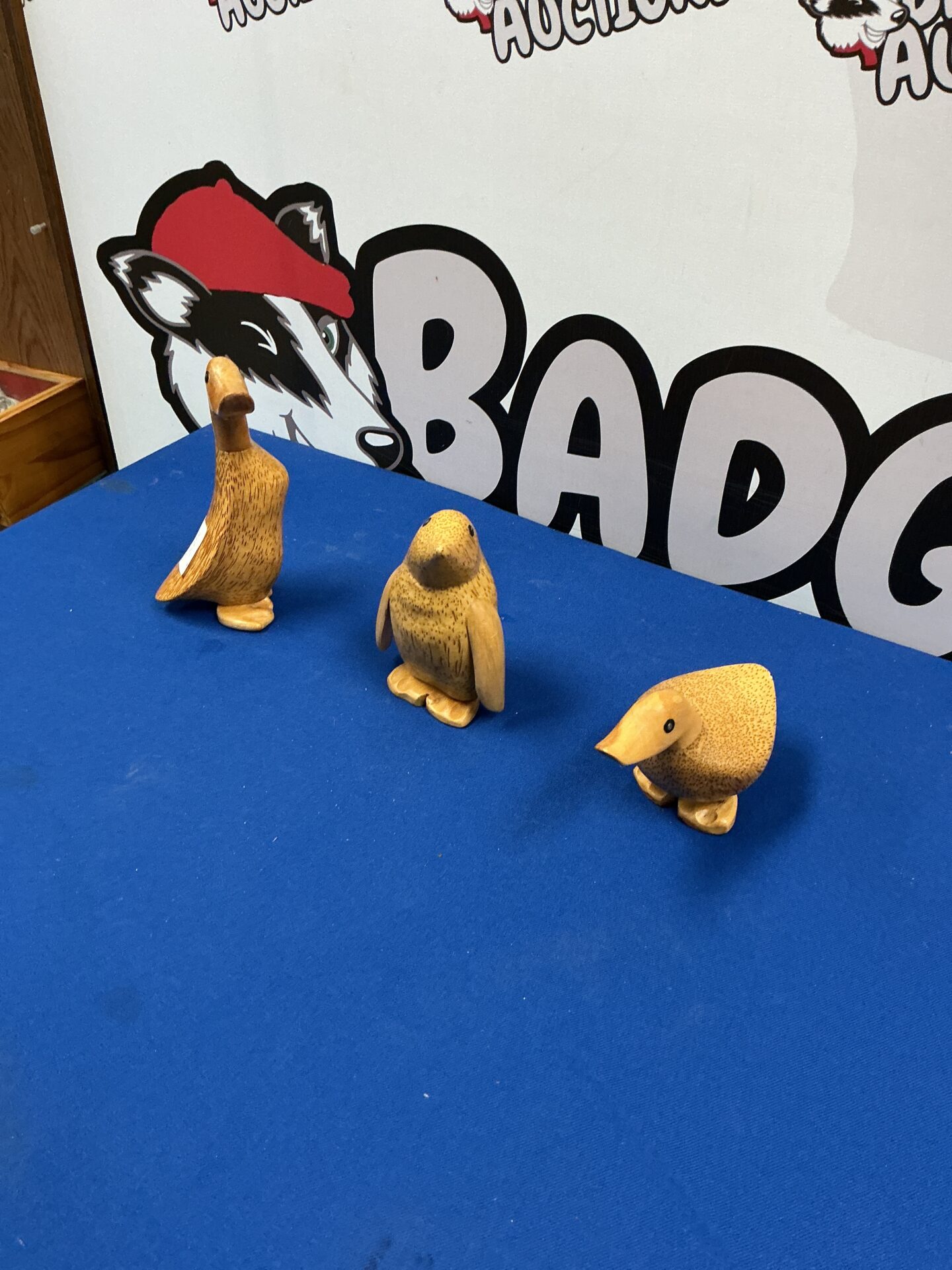This lot comprises three charming wooden bird ornaments, each hand-carved to depict a different avian form. The birds exhibit a rustic, folk art aesthetic, likely created as decorative pieces for the home. Their simple yet elegant designs and warm wooden tones suggest they could be from a variety of eras, adding to their appeal.