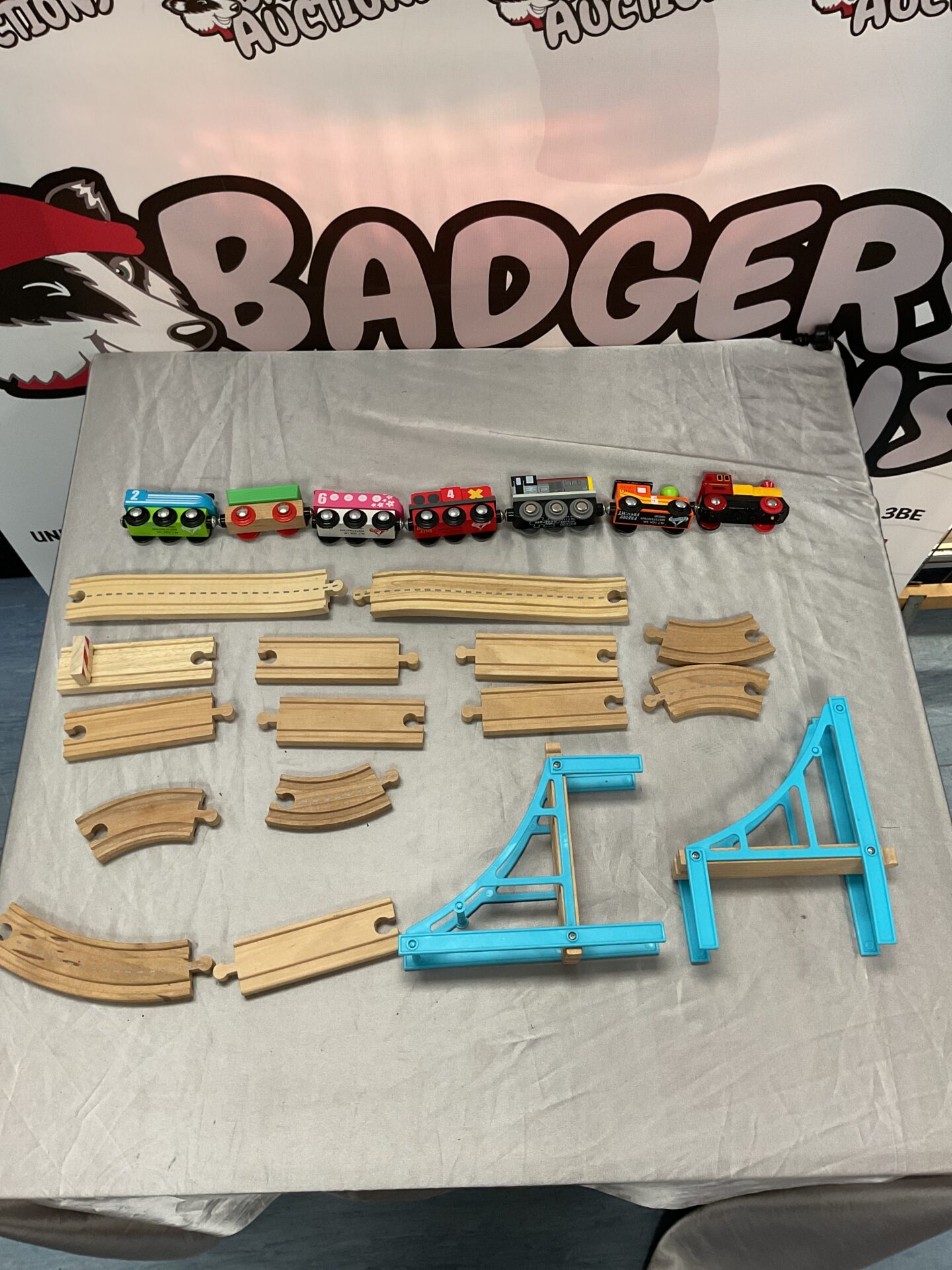 This extensive collection features a charming wooden carousel train set, complete with track pieces, bridges, and various accessories. The set appears to be designed for imaginative play, offering a classic toy experience. The wooden construction suggests durability and a timeless appeal, reminiscent of traditional toy craftsmanship.