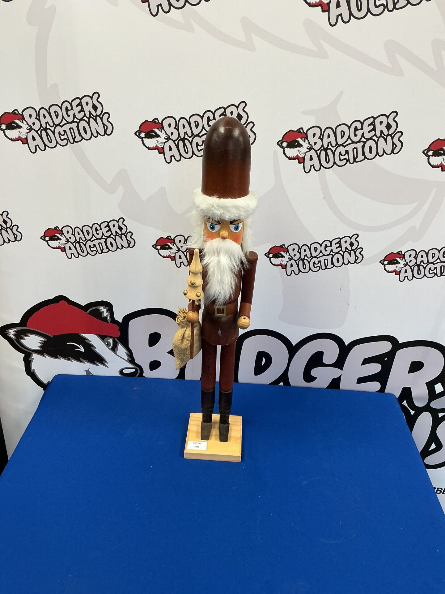 This wooden soldier exhibits signs consistent with age and use. While it presents a lovely vintage appearance, it may have minor imperfections or wear. This figure would be a welcome addition to a collection of vintage holiday decorations or a unique display piece for Christmas enthusiasts.