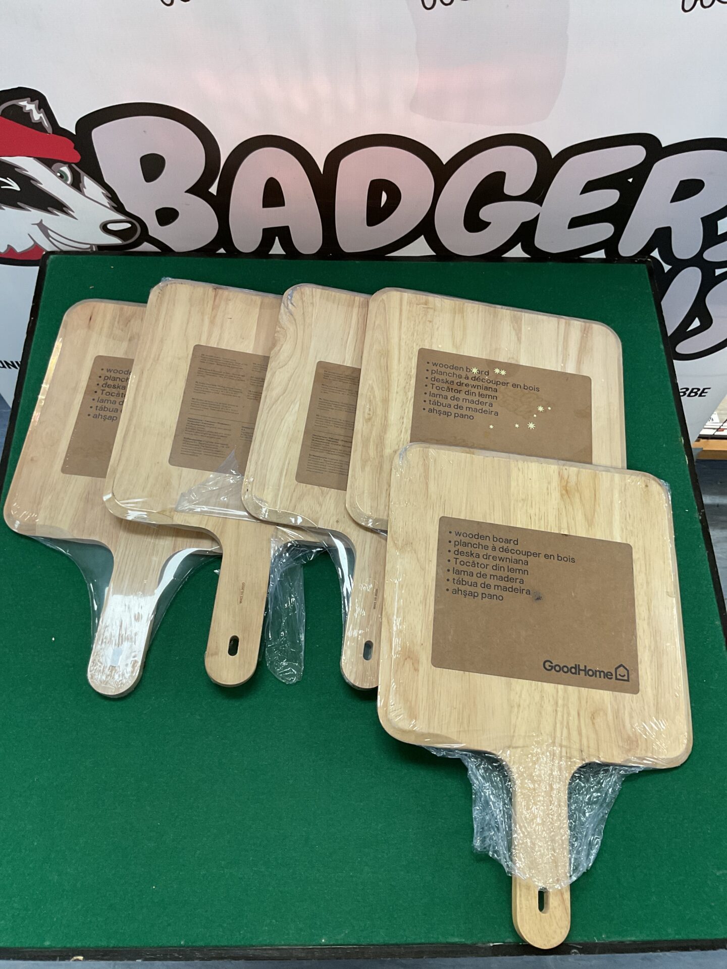 This lot includes five goodhome wooden cutting boards, ideal for food preparation and serving. Crafted from wood, these boards offer a durable and natural surface for chopping, slicing, and more. They show signs of use, adding to their rustic charm and character.