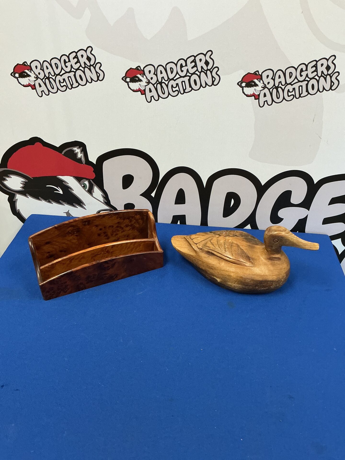 The letter rack shows signs of age and wear, with some minor surface scratches and imperfections to the wood. However, these only add to its character and vintage appeal. This piece would be of interest to collectors of carved wooden items, duck-themed collectibles, or those seeking a unique and functional desk tidy.