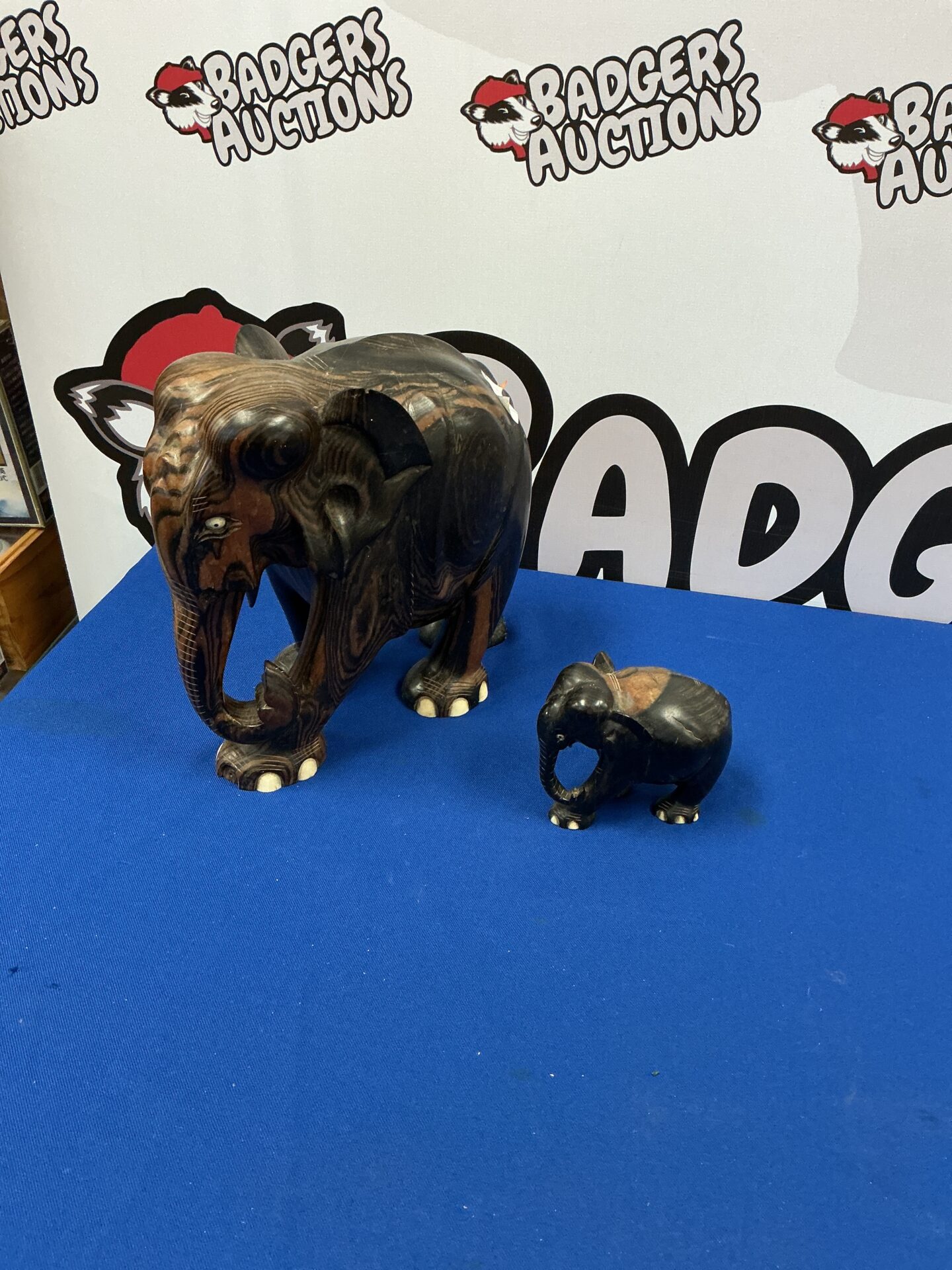This lot features two hand-carved wooden elephant ornaments, perfect for adding a touch of exotic charm to any home. Crafted from a dark-toned wood, these detailed figurines showcase a folk art style and naturalistic form. Ideal for collectors of animal figurines or unique home decor.